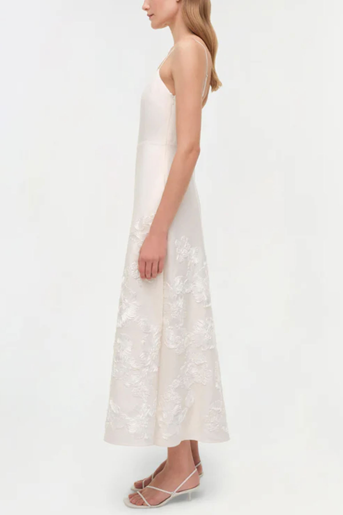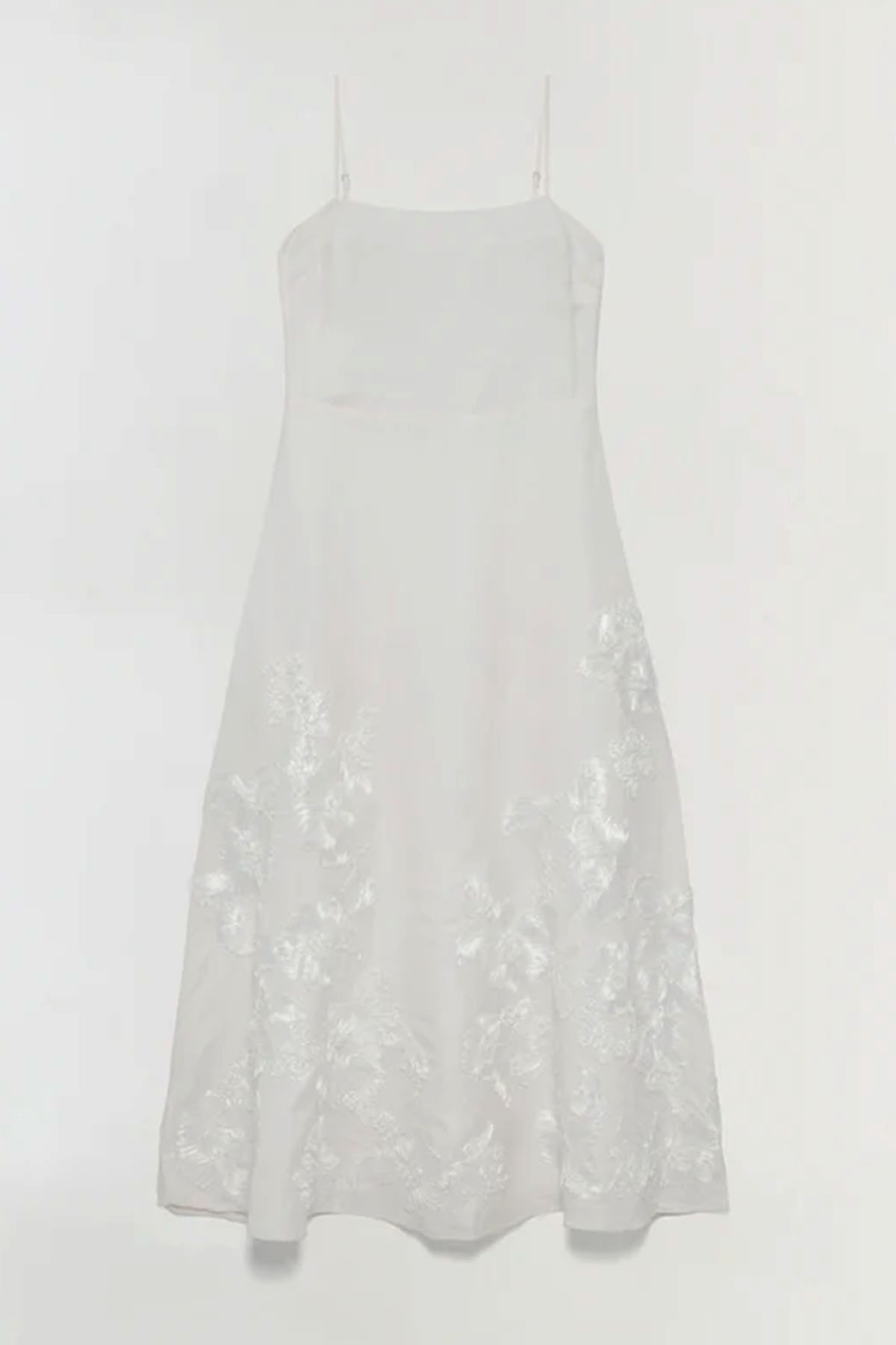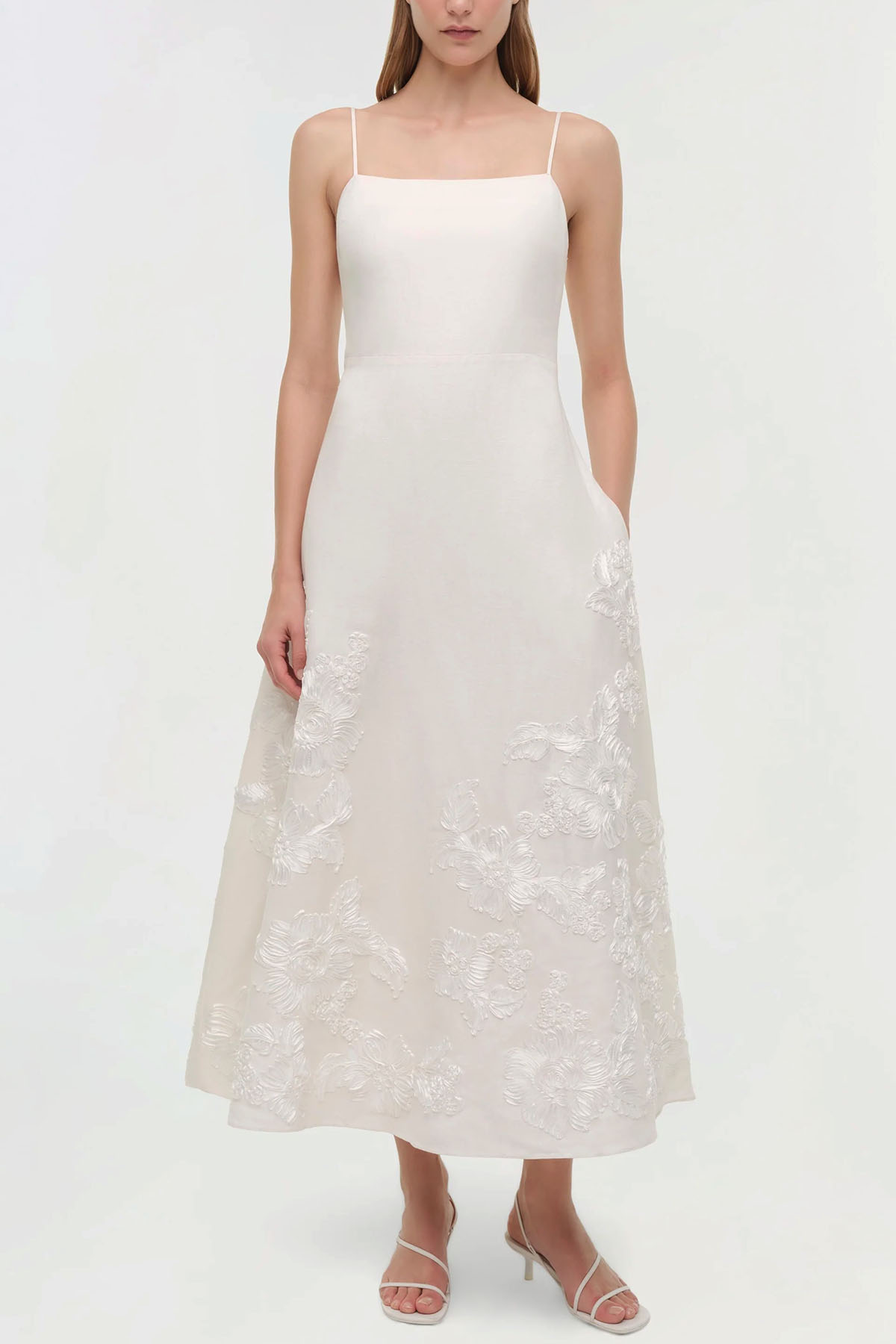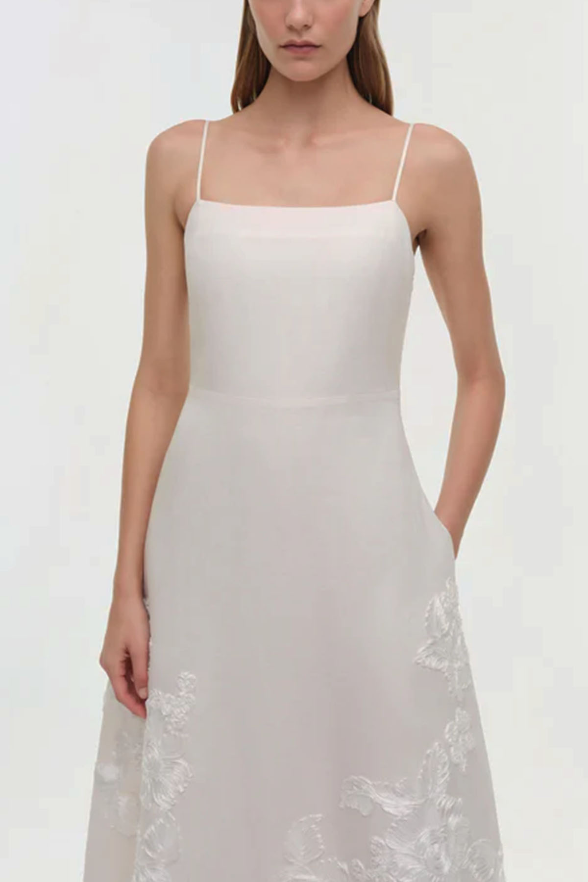 modello avorio realizzato in un misto lino strutturato ma traspirante, impreziosito da un delicato ricamo soutache che contrasta con le sue linee pulite, lunghezza midi, spalline sottili regolabili, tasche laterali nascoste, chiusura con zip laterale nascosta.
