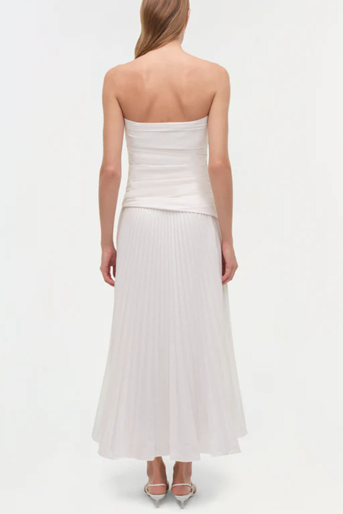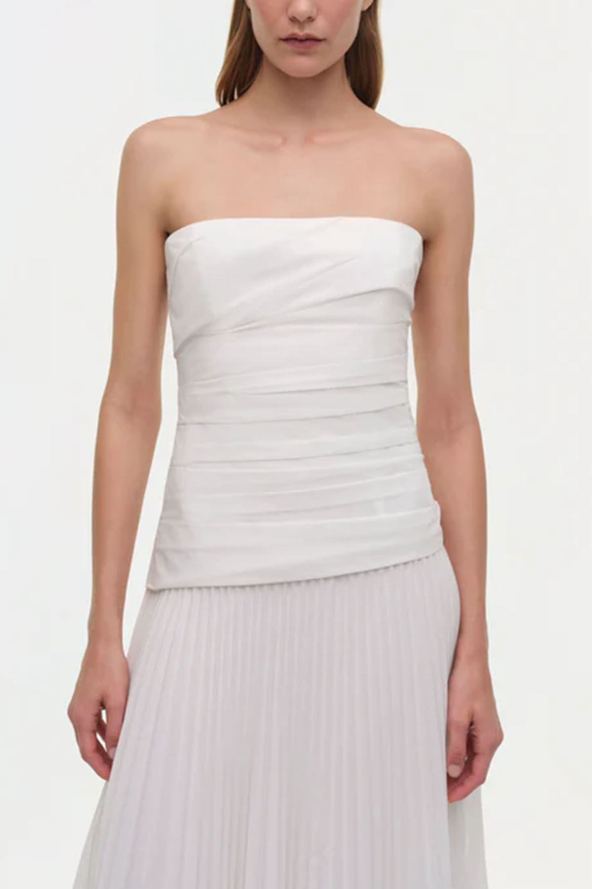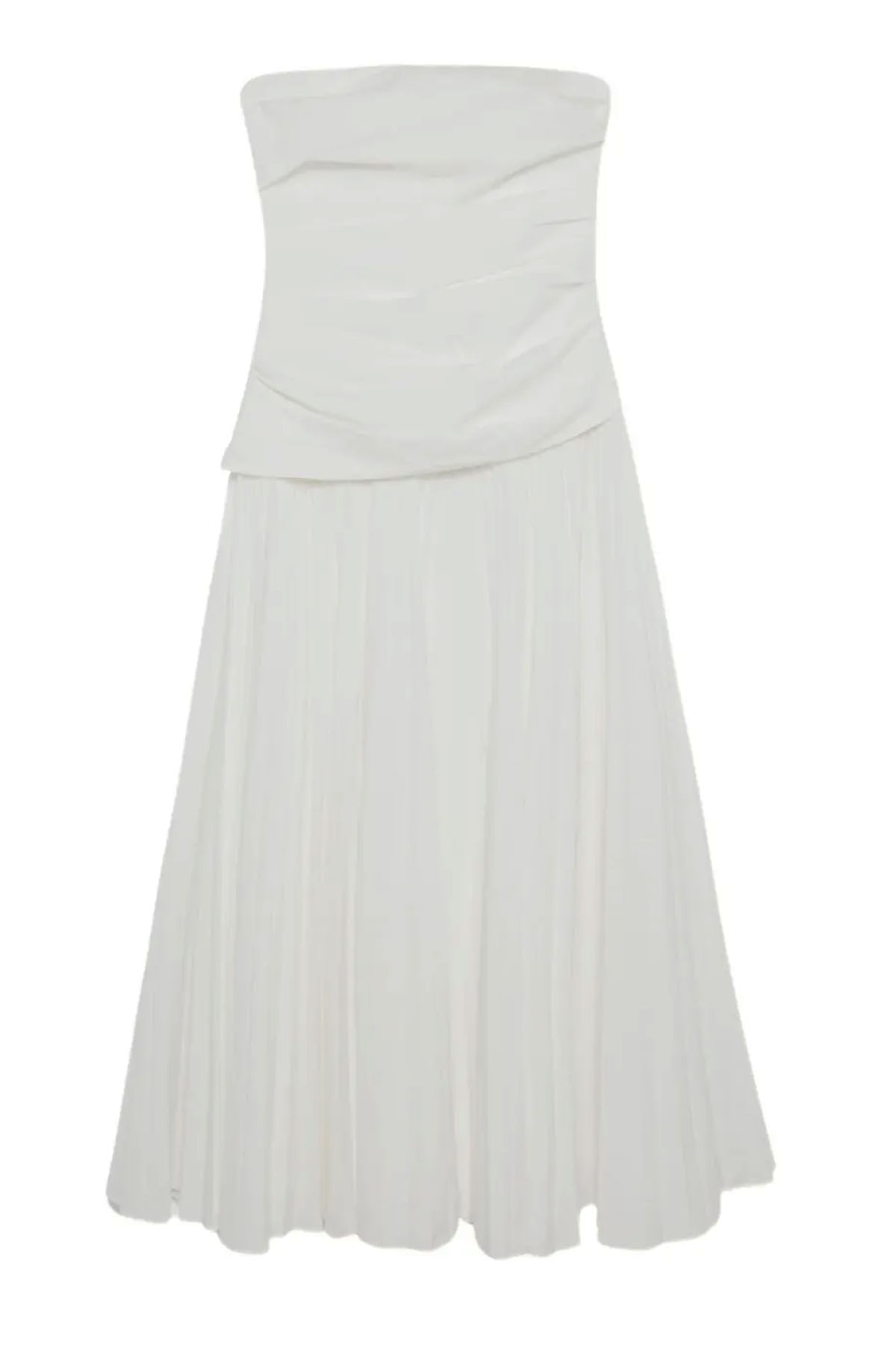 Abito in bianco realizzato in popeline plissettato, bustier midi senza spalline presenta un corpetto scolpito e una gonna plissettata fluida, chiusura laterale con zip nascosta, spalline regolabili e rimovibili.