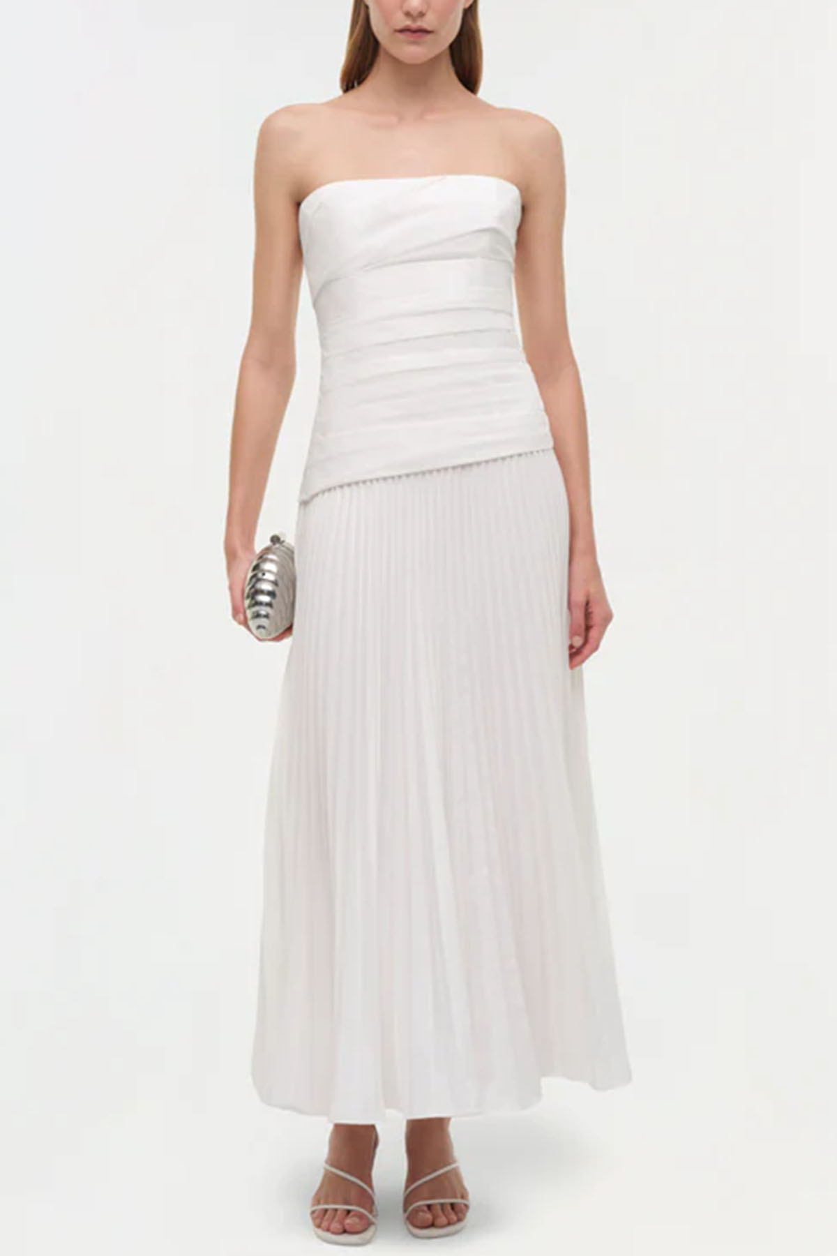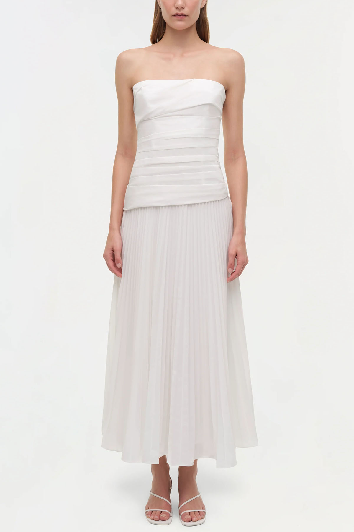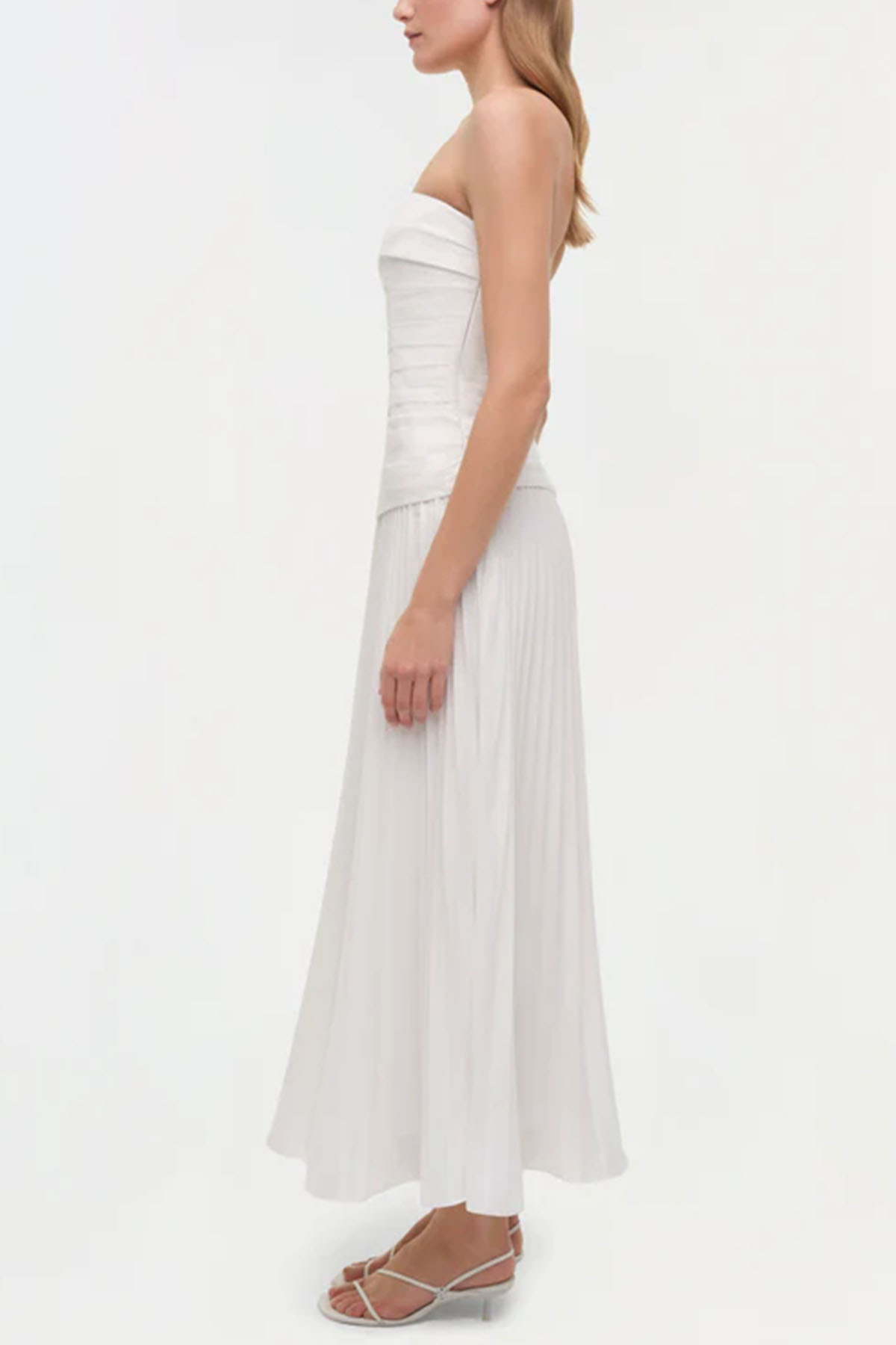 Abito in bianco realizzato in popeline plissettato, bustier midi senza spalline presenta un corpetto scolpito e una gonna plissettata fluida, chiusura laterale con zip nascosta, spalline regolabili e rimovibili.