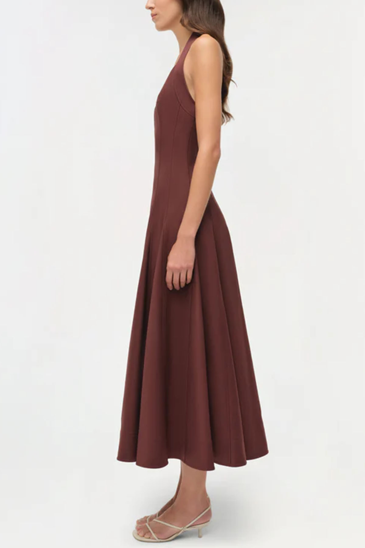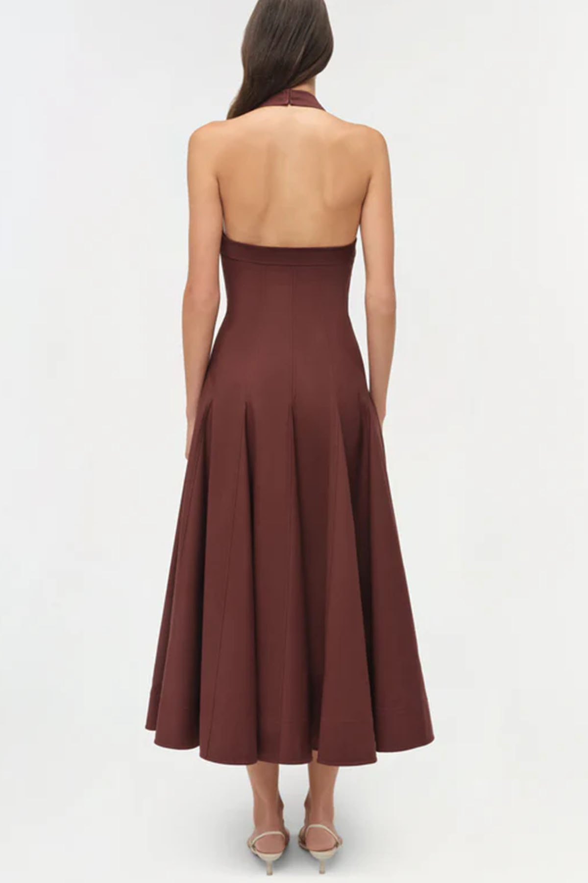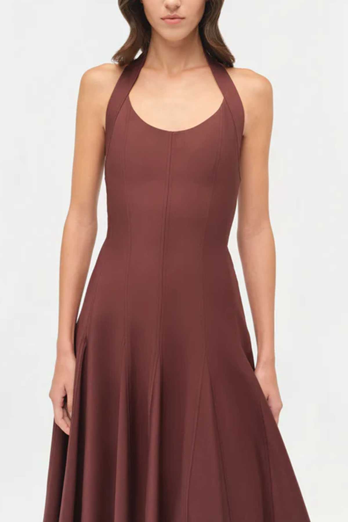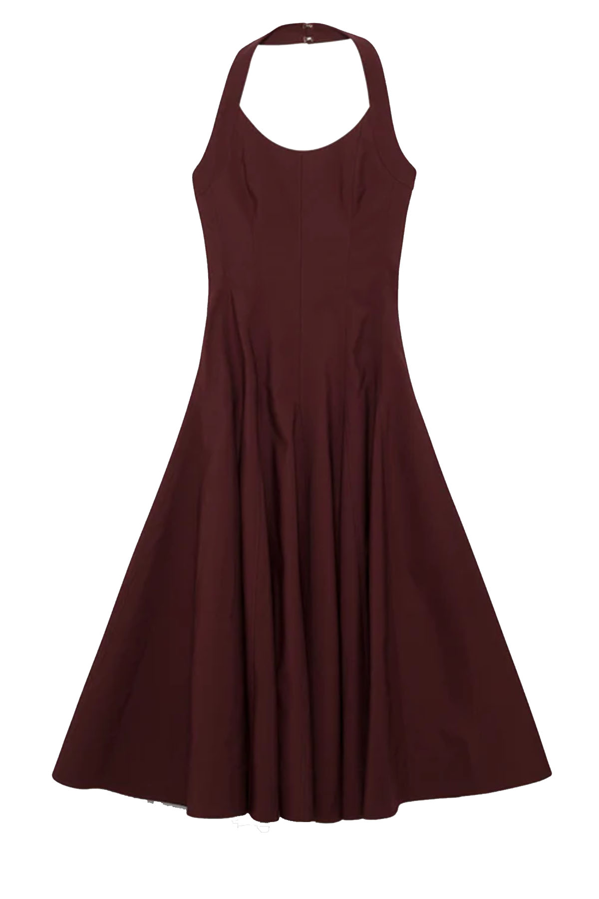 modello realizzato in cotone compatto, presenta un corpetto aderente con scollo all'americana e cuciture a pannelli che definiscono la vita, la gonna si adatta a una silhouette fluida di media lunghezza con volume e movimento naturali, schiena scollata.