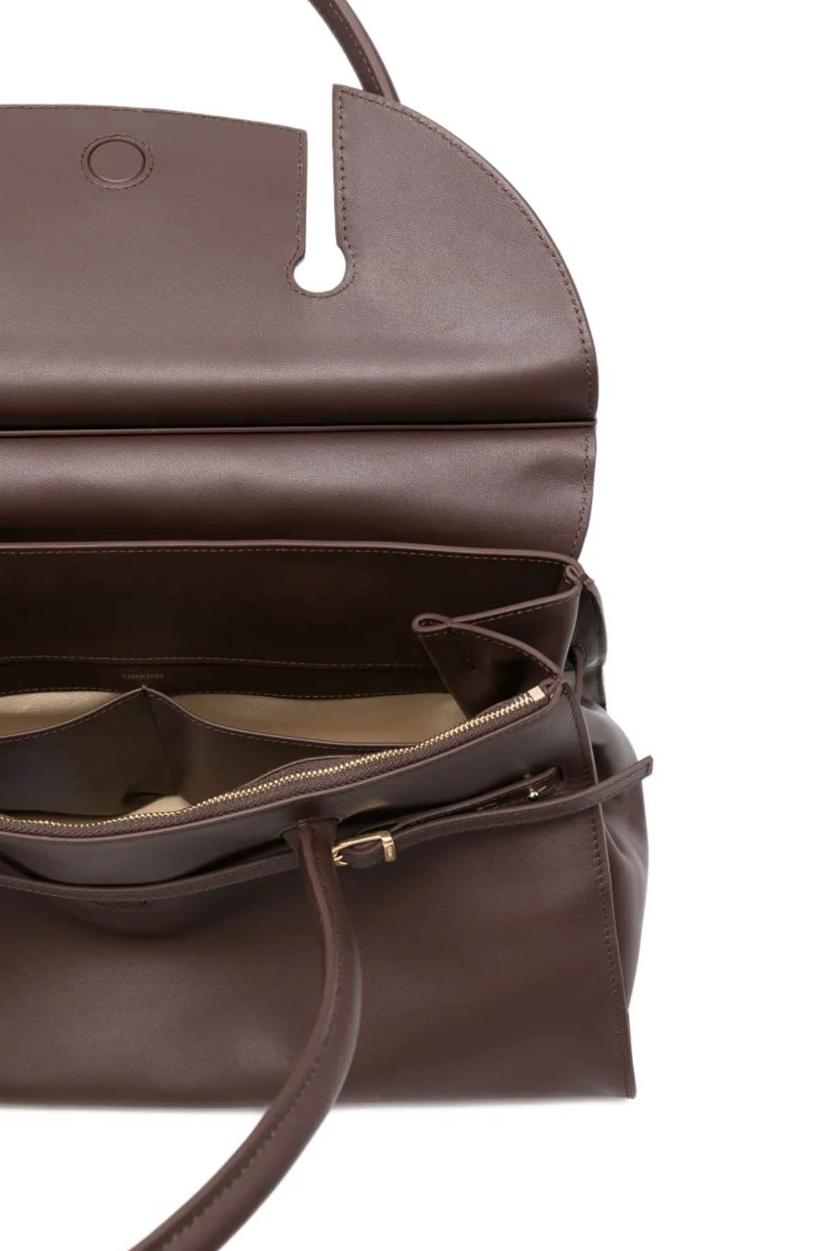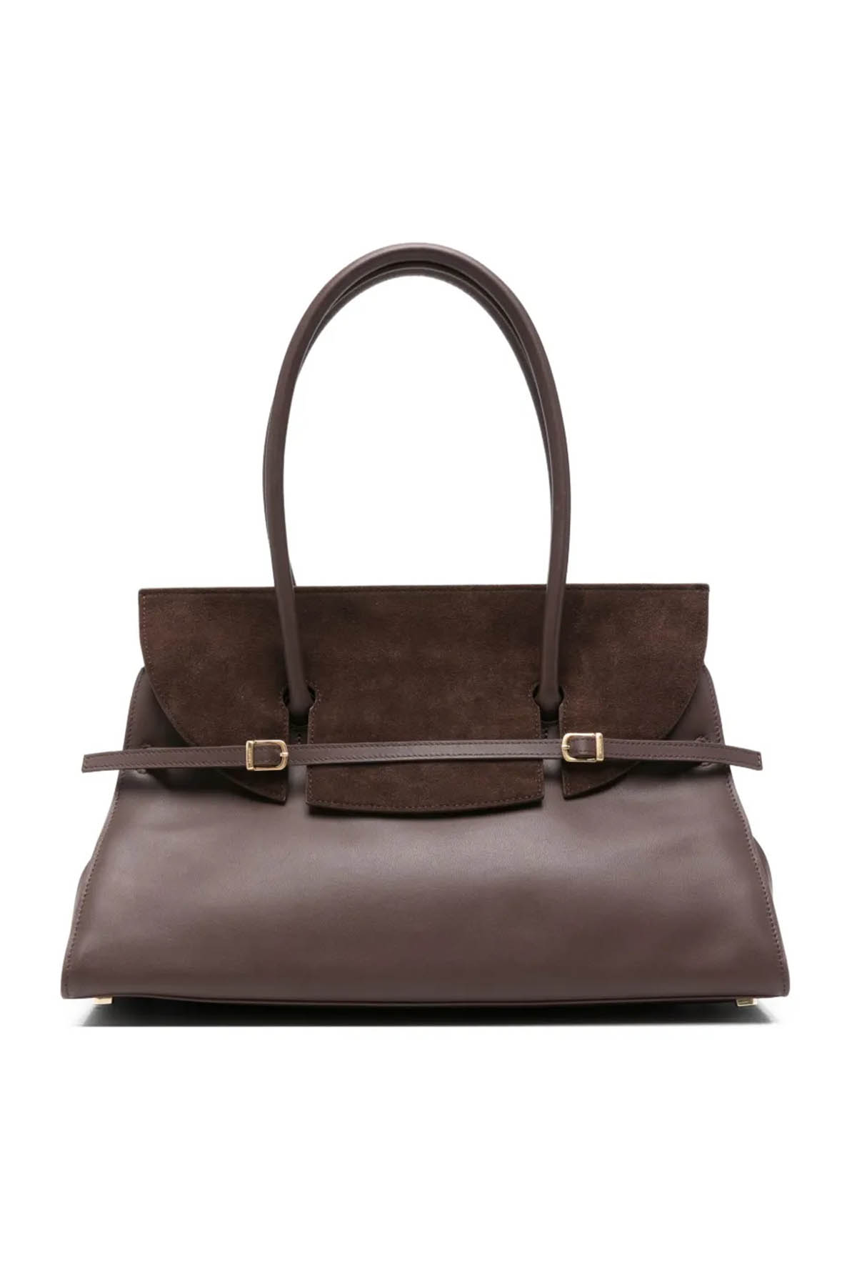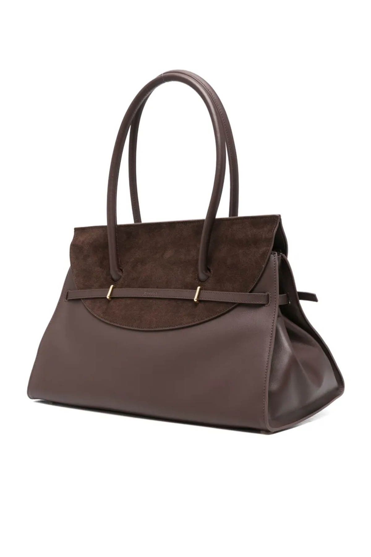 Modello con inserto in pelle scamosciata, due manici, dettaglio fibbia, tasca interna con zip, dettagli color oro.