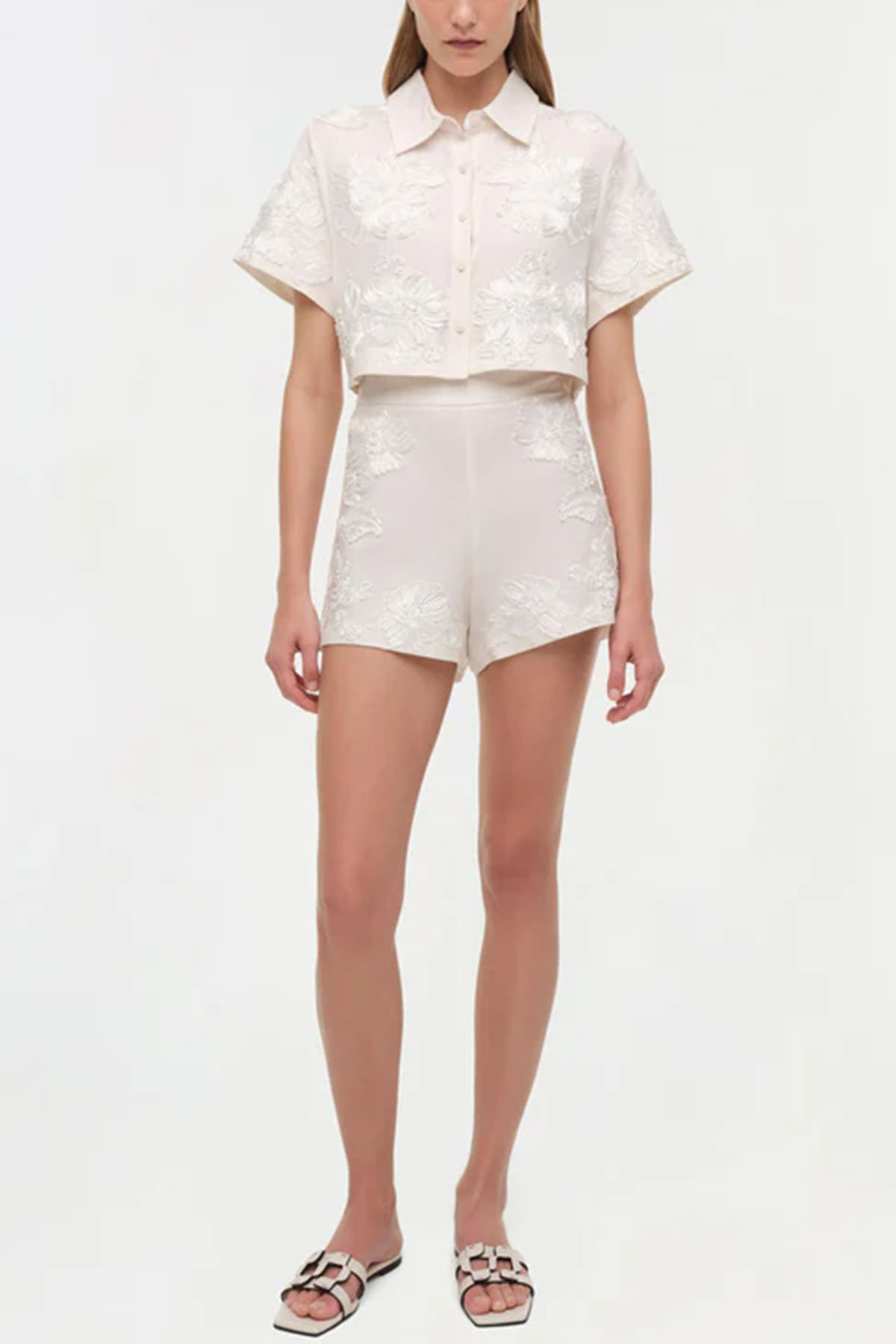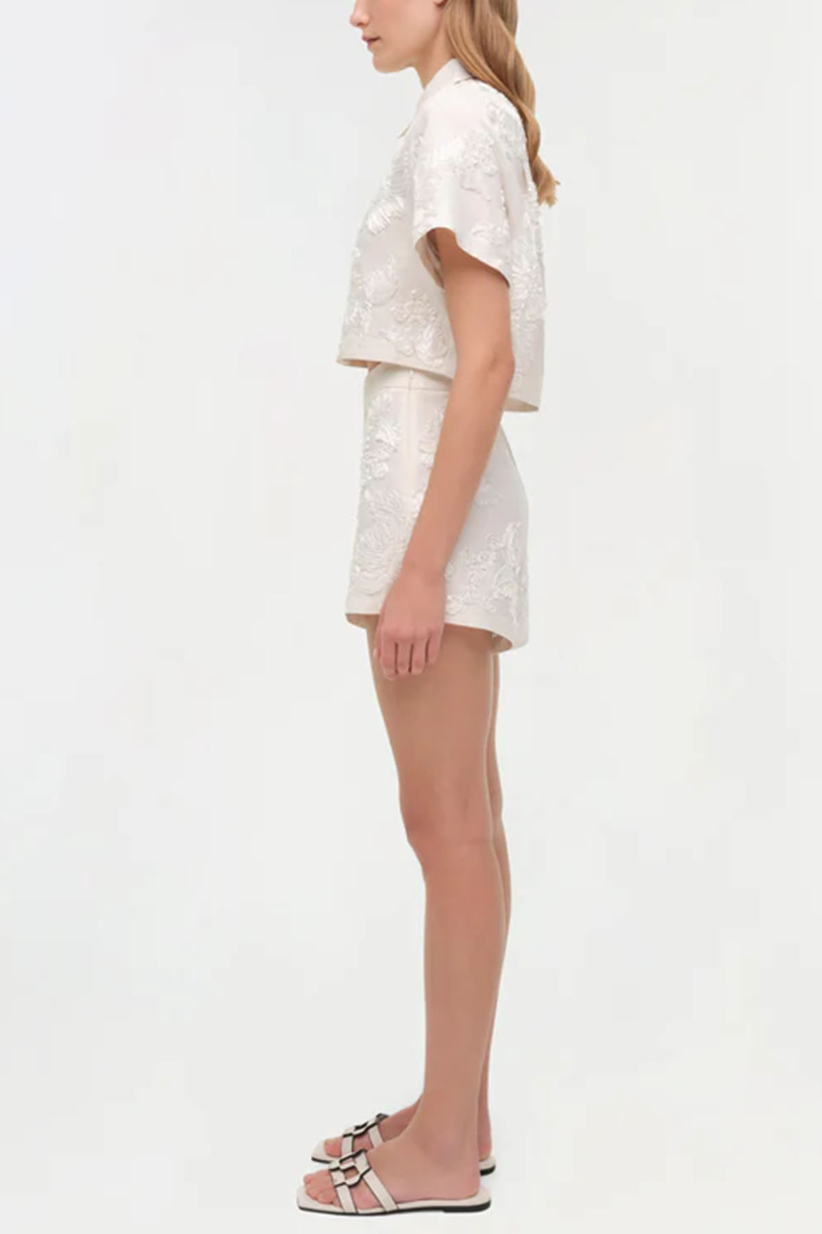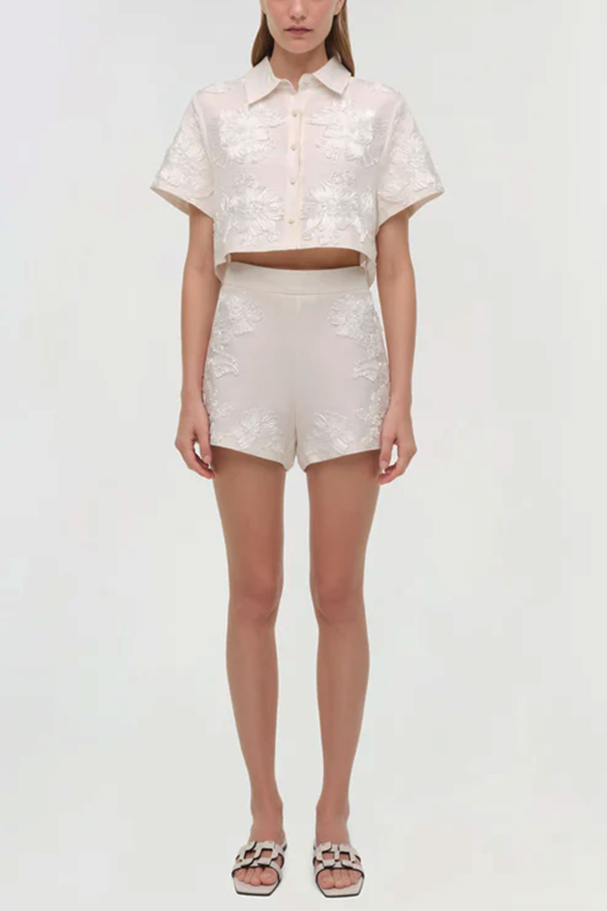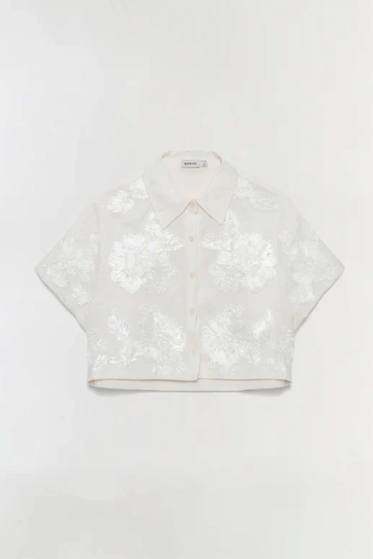 camicia avorio realizzata in morbido lino traspirante, design corto, caratterizzata da un ricamo soutache tono su tono, colletto classico, abbottonatura frontale.