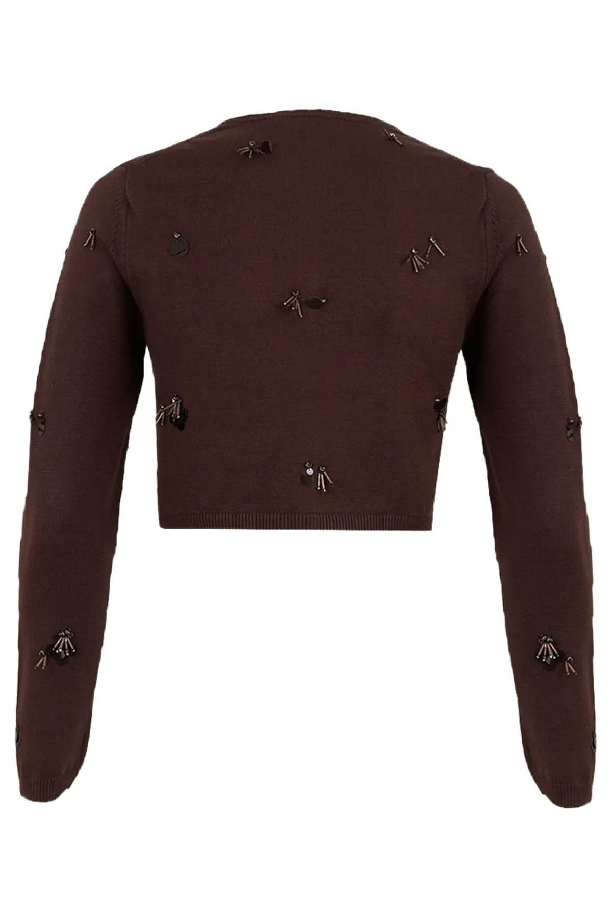 Modello girocollo, manica lunga, abbottonatura frontale, decorazioni applicate, design corto.