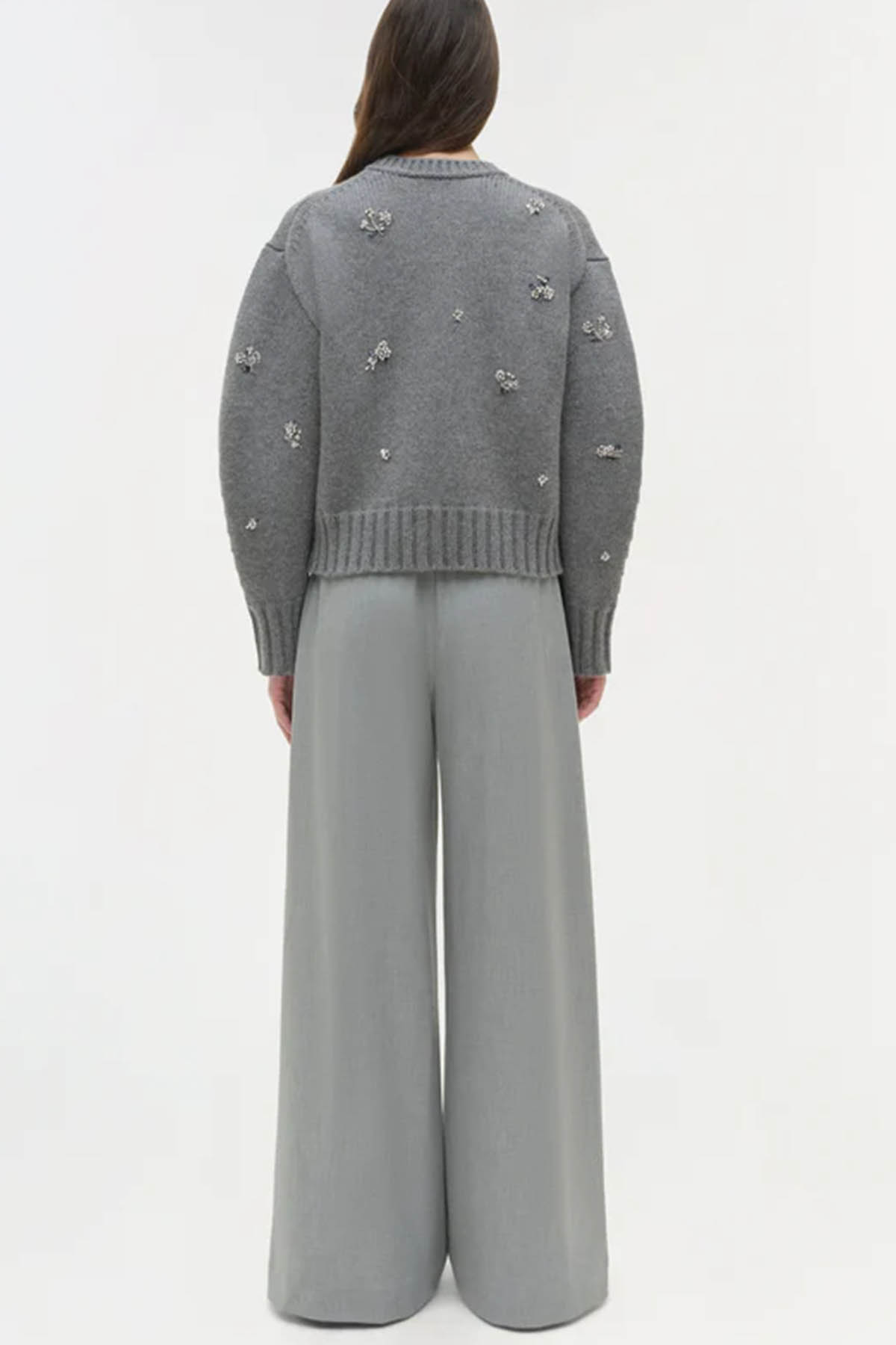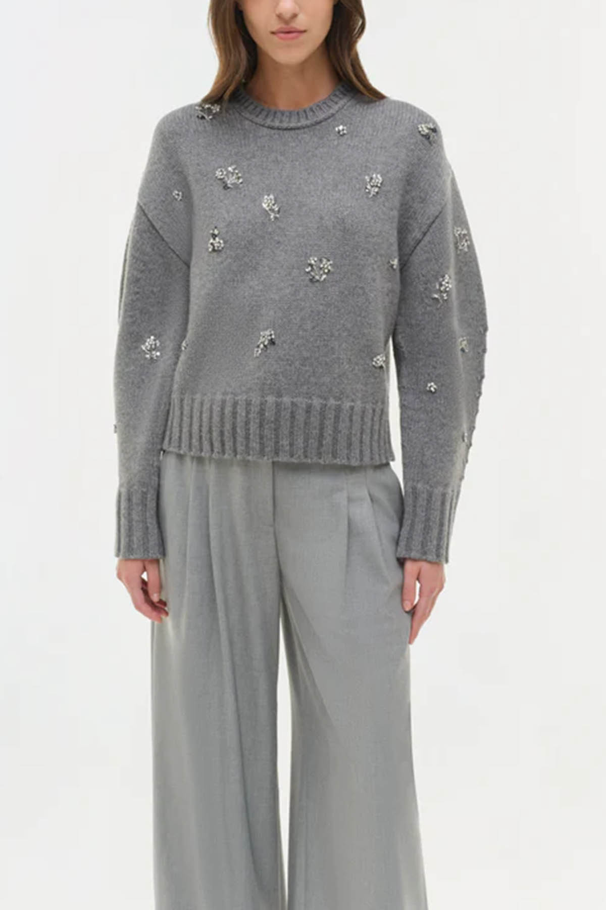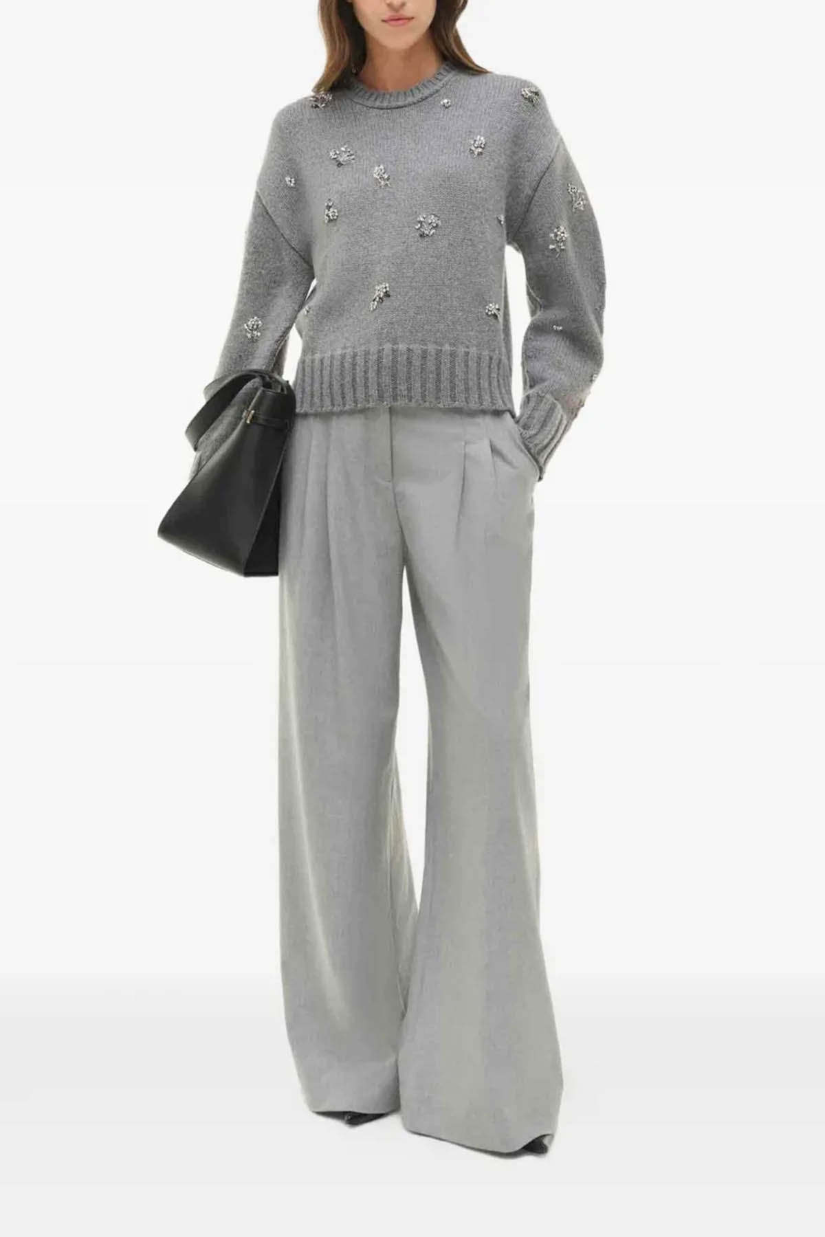 Modello girocollo, taglio spalla basso, manica lunga, orlo e polsini a coste, decorazioni in cristallo applicate.