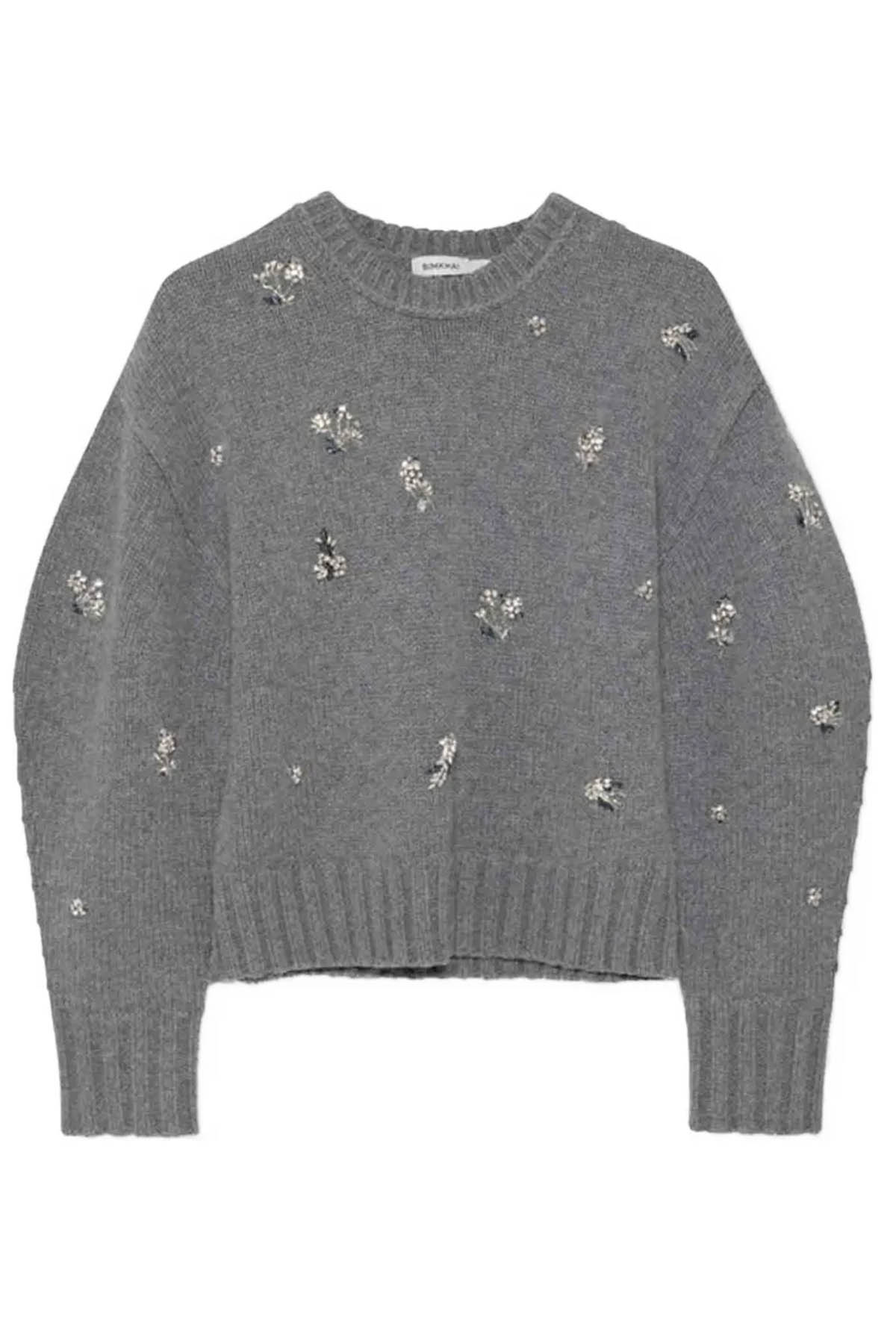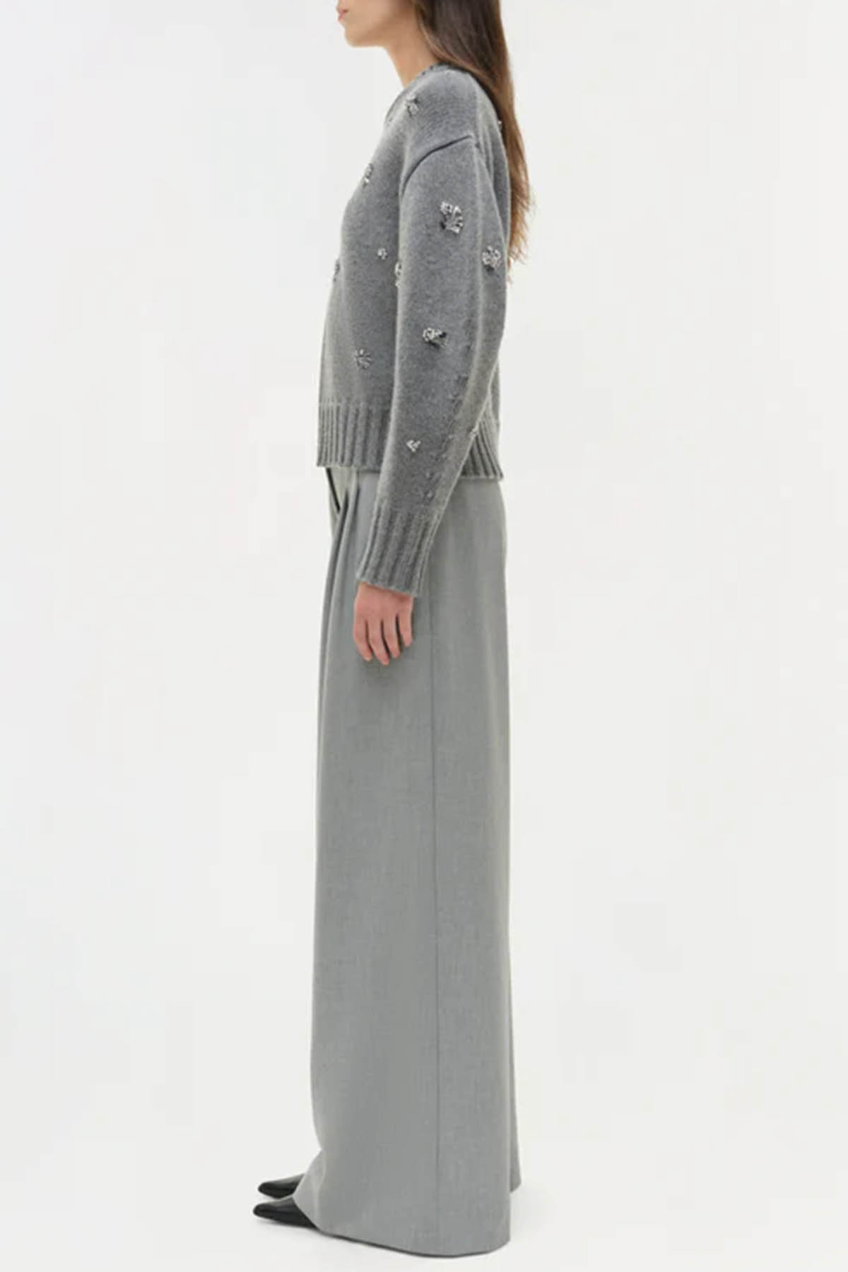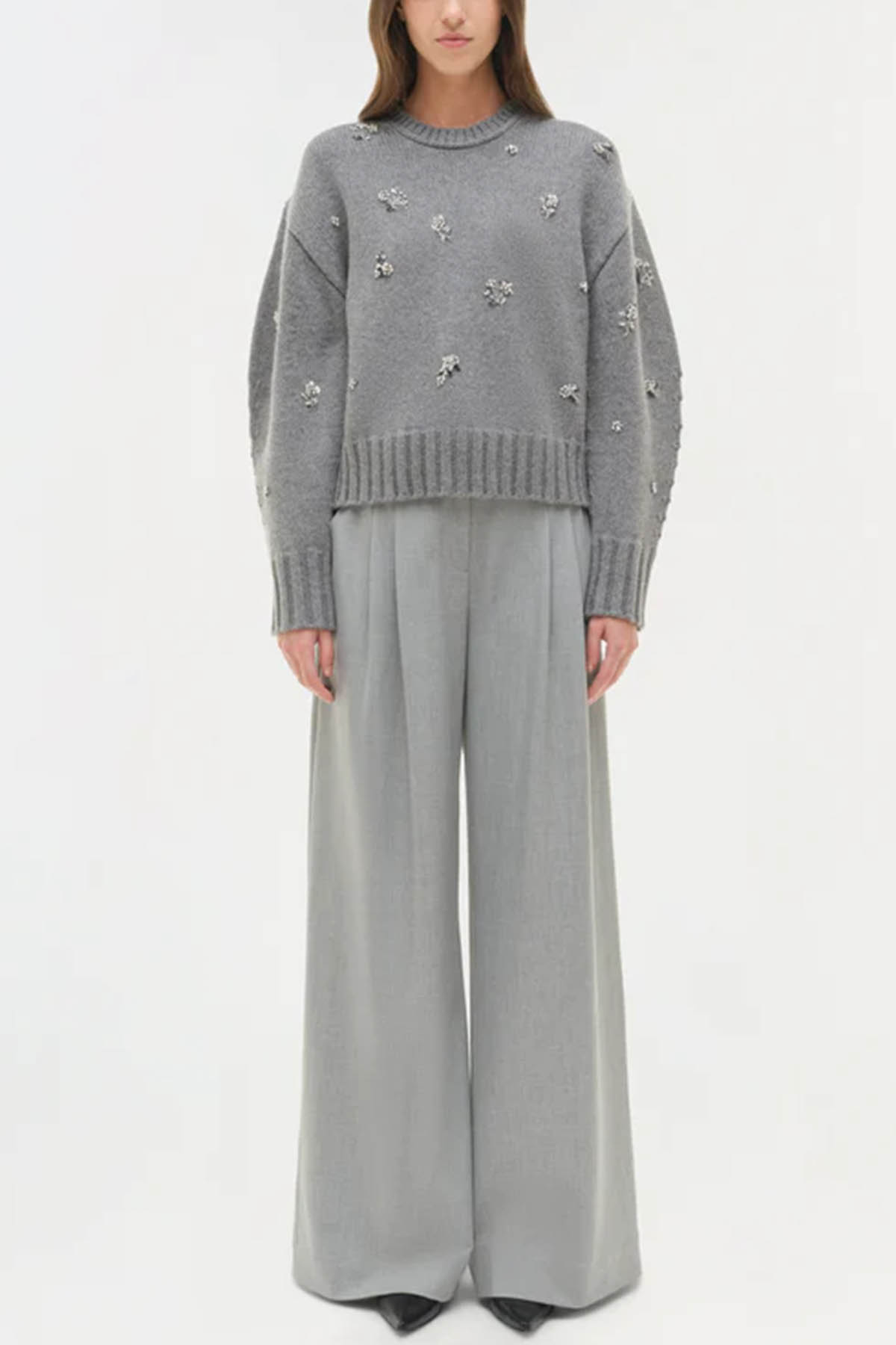 Modello girocollo, taglio spalla basso, manica lunga, orlo e polsini a coste, decorazioni in cristallo applicate.