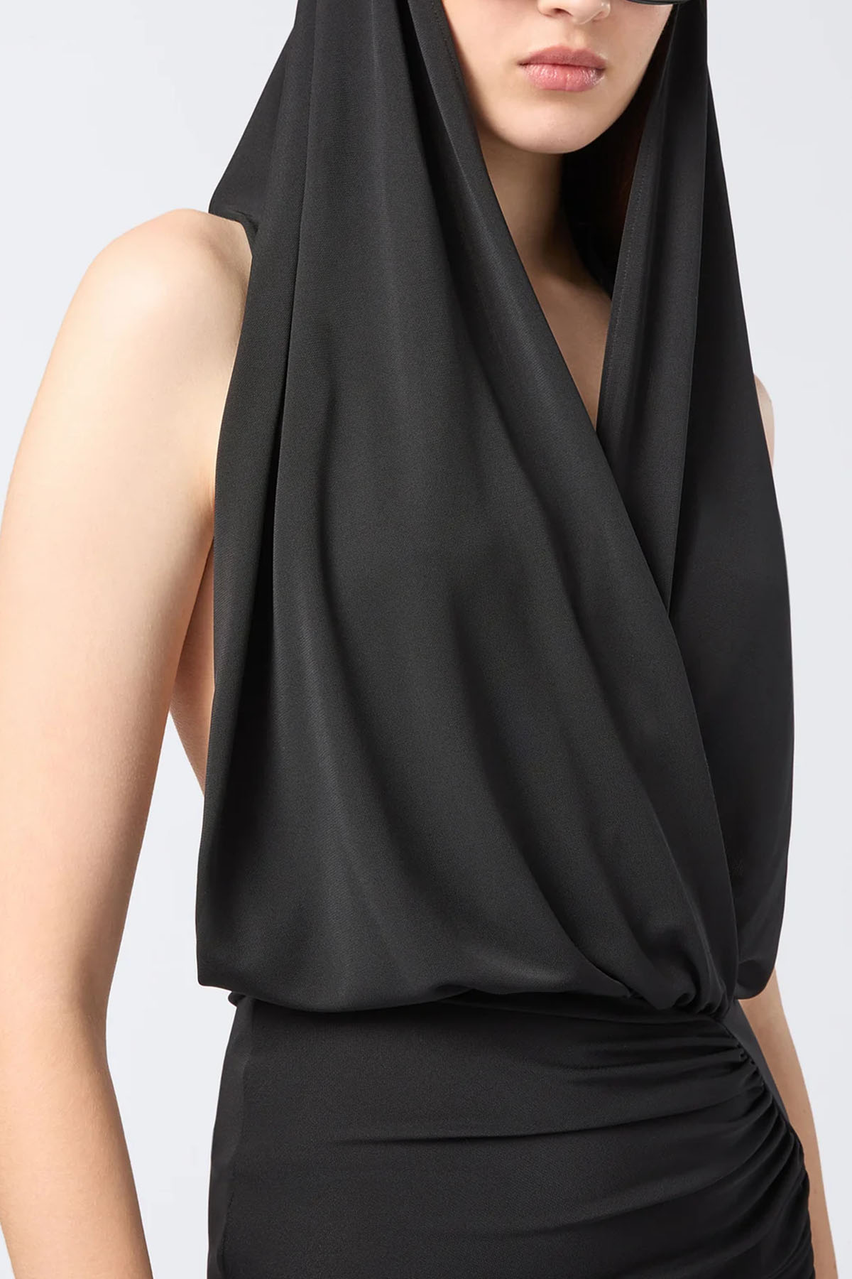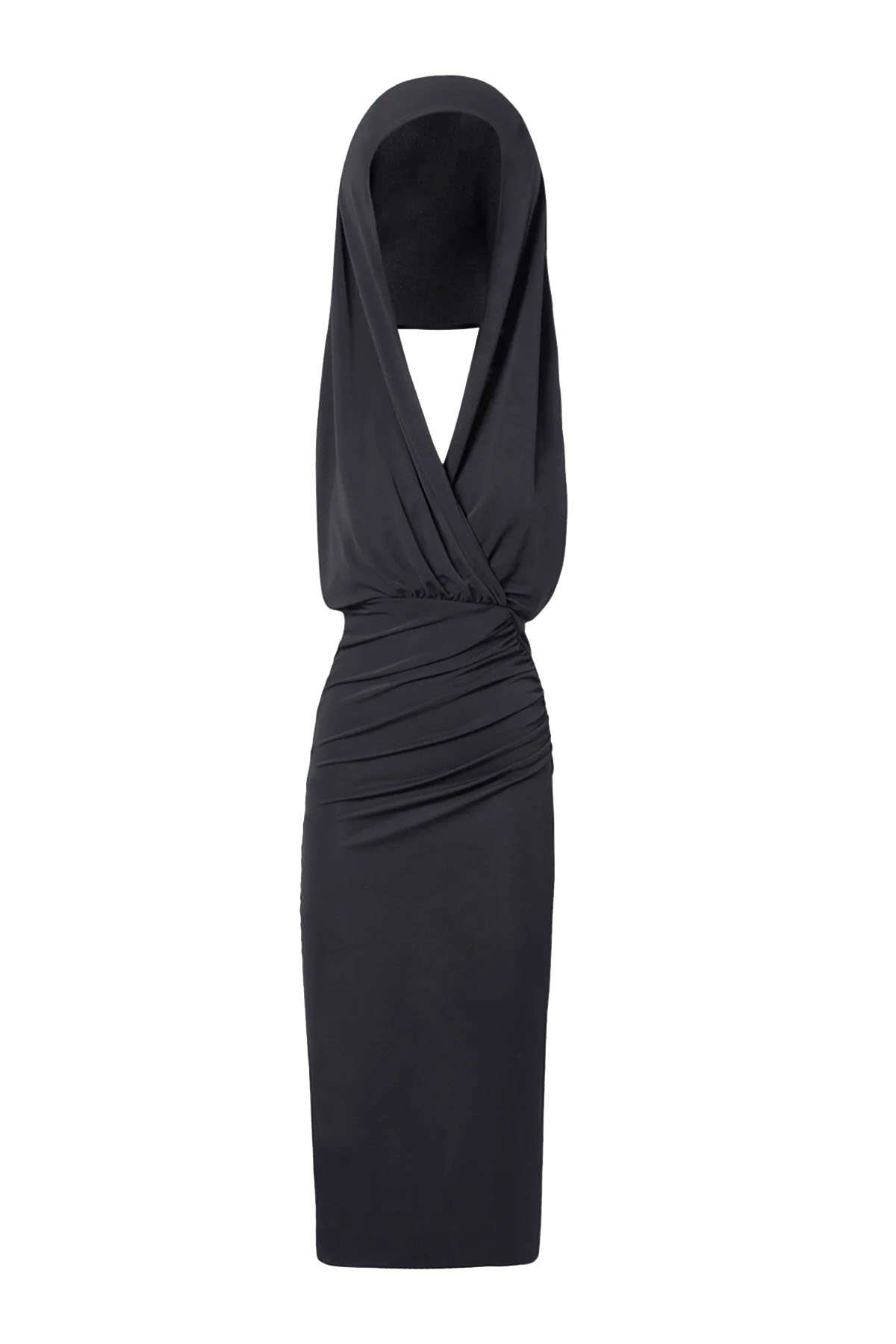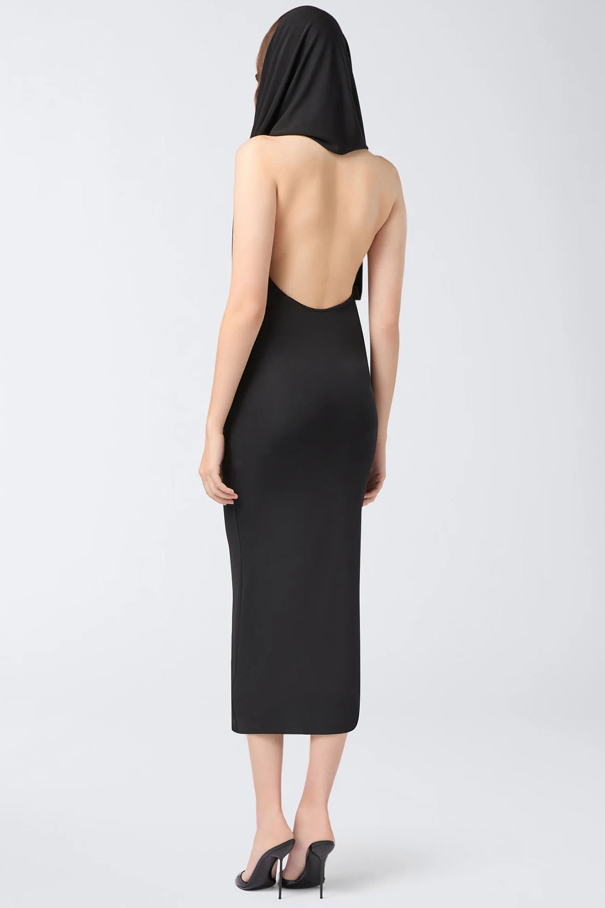 abito di colore nero, cappuccio, realizzato in jersey interlock, design incrociato sul davanti, schiena scoperta, gonna aderente, di media lunghezza.