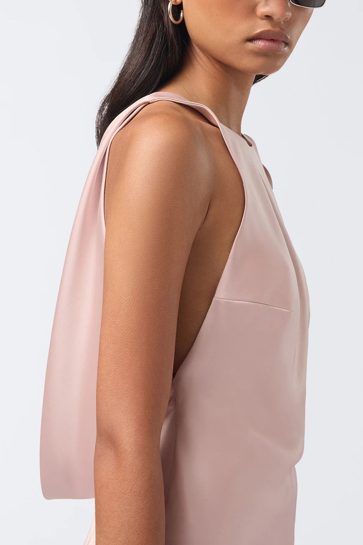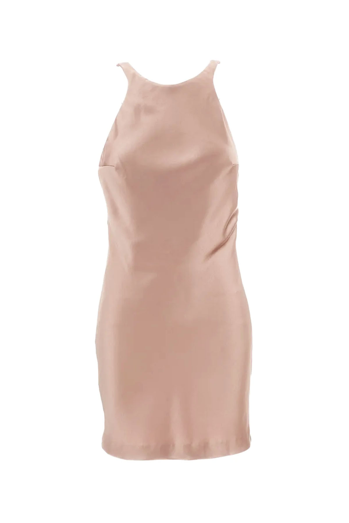 abito di colore rosa realizzato in raso liquido, girocollo, senza maniche, schiena scoperta con drappeggio sul fondo, design corto.