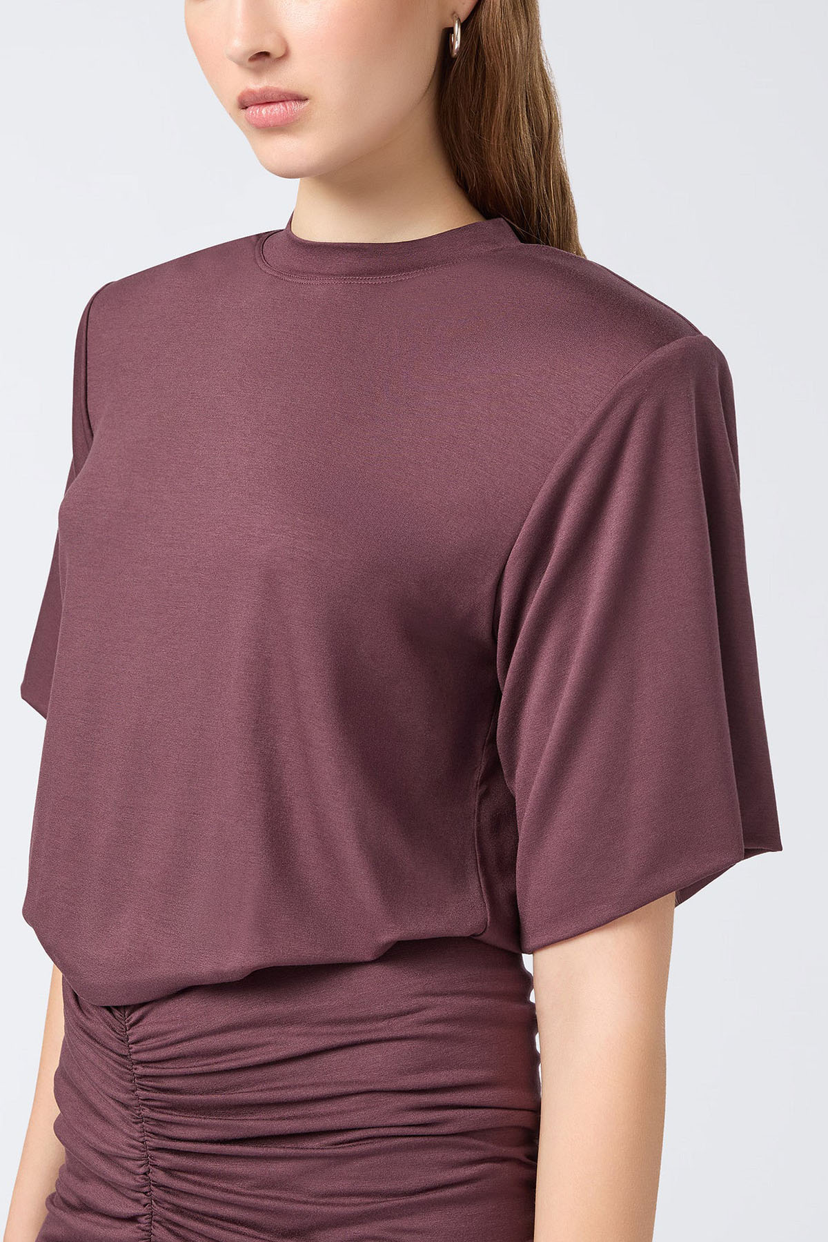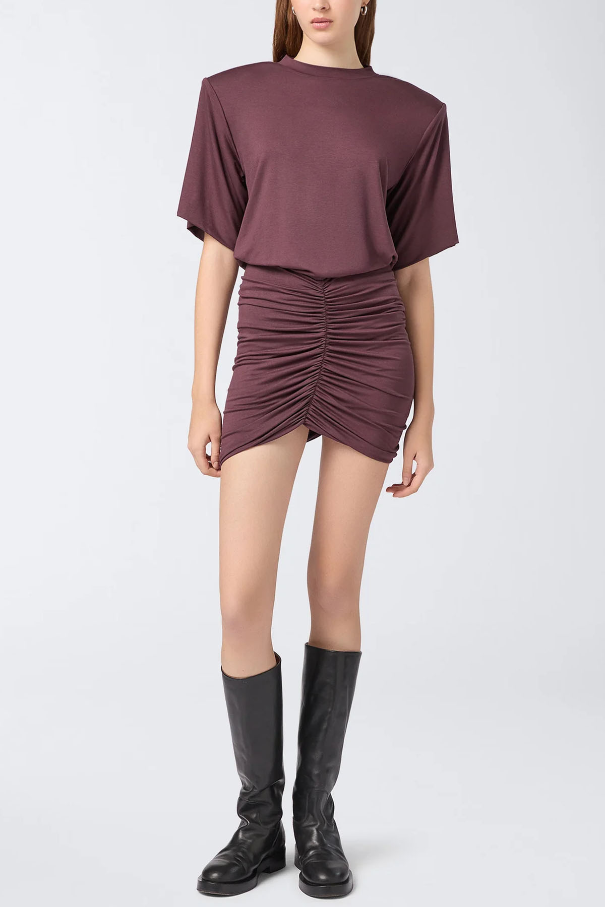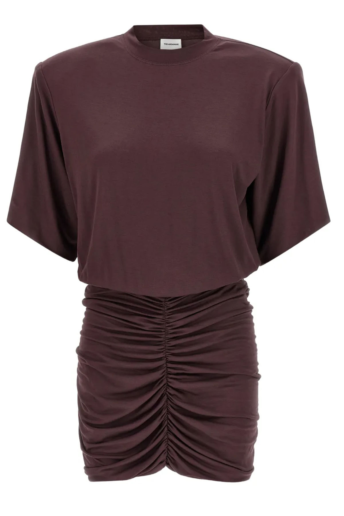 abito realizzato in jersey di colore bordeaux, girocollo, manica 3/4, spalline imbottite, gonna aderente e arricciata, design corto.