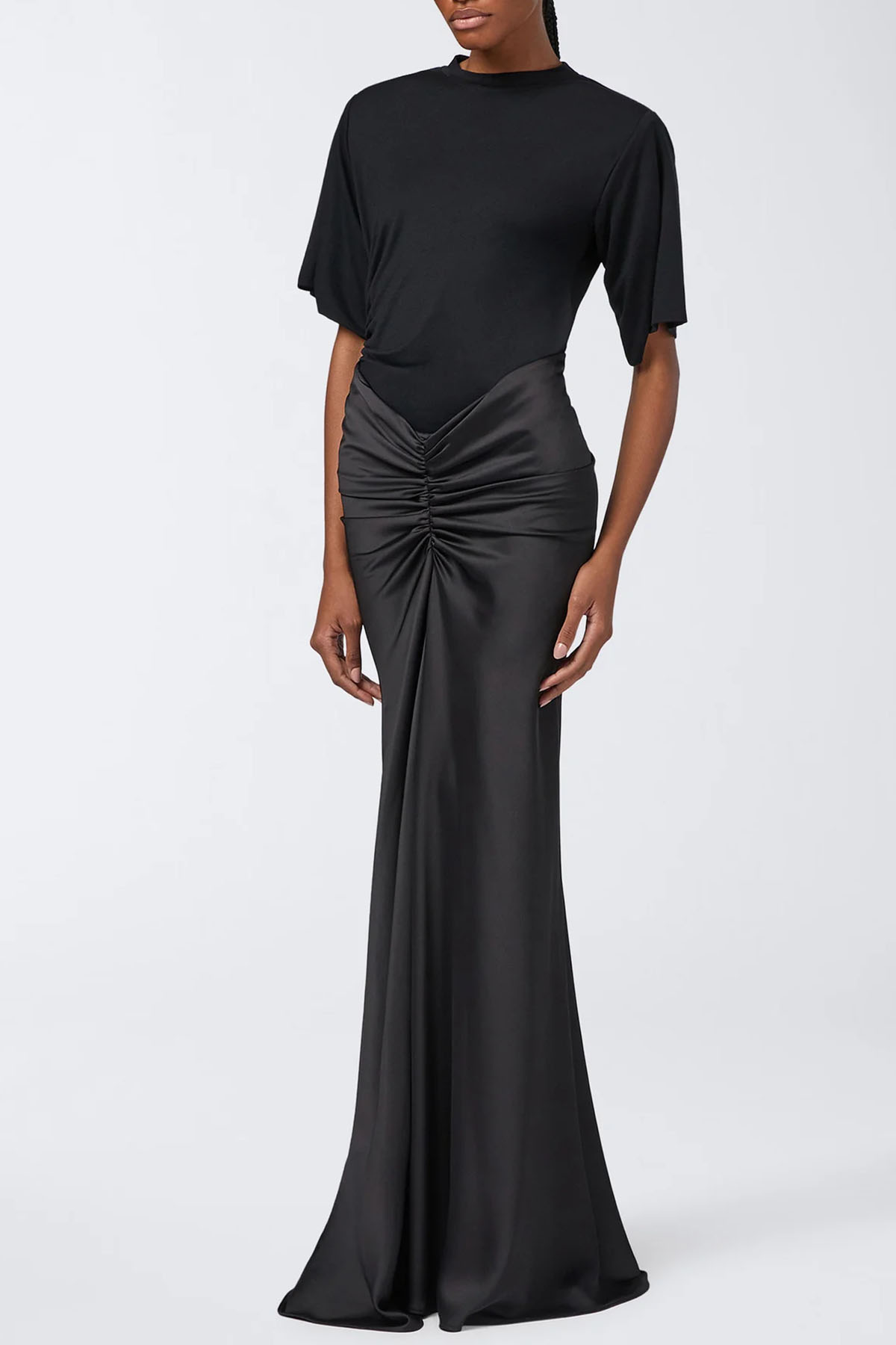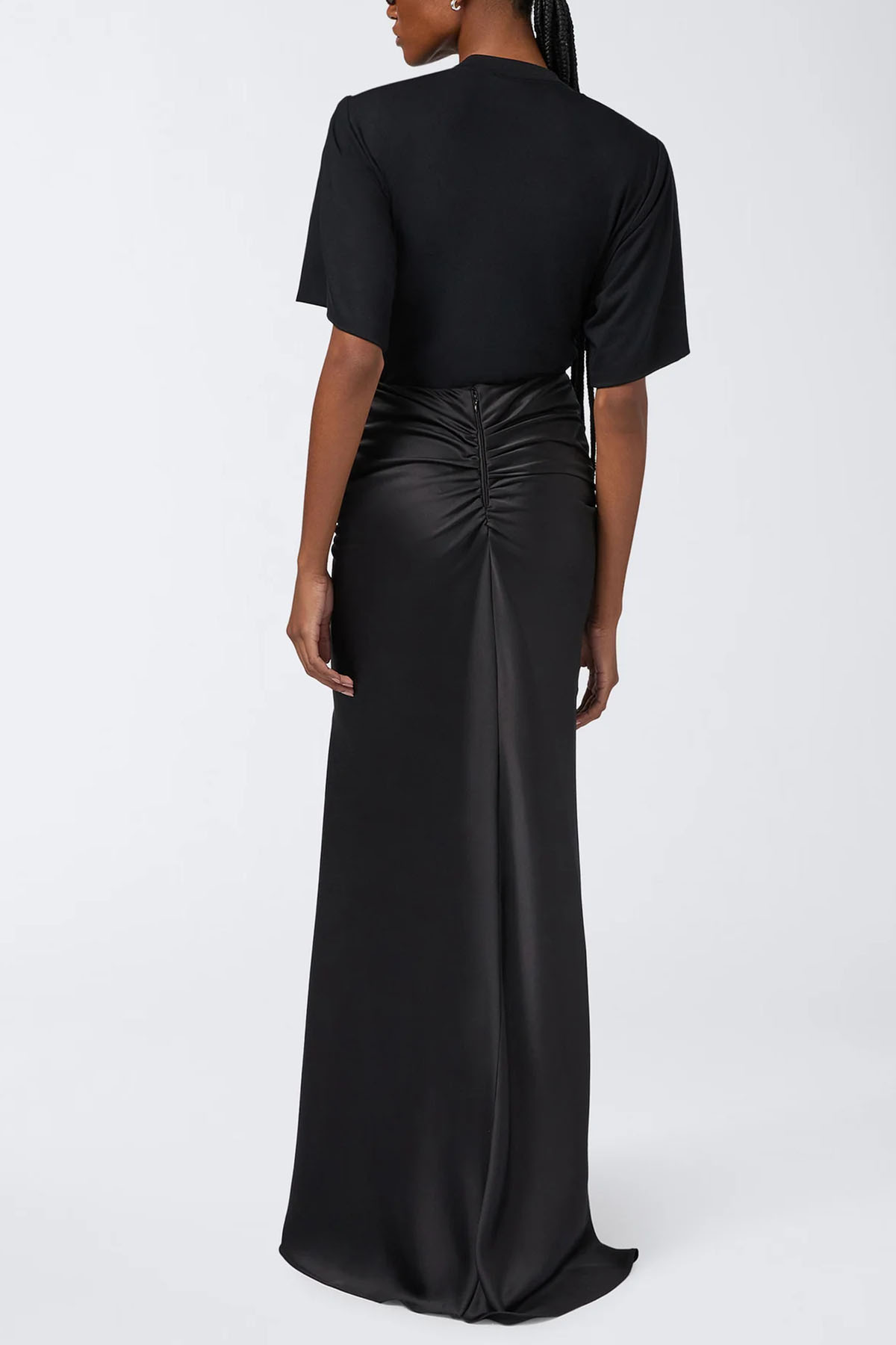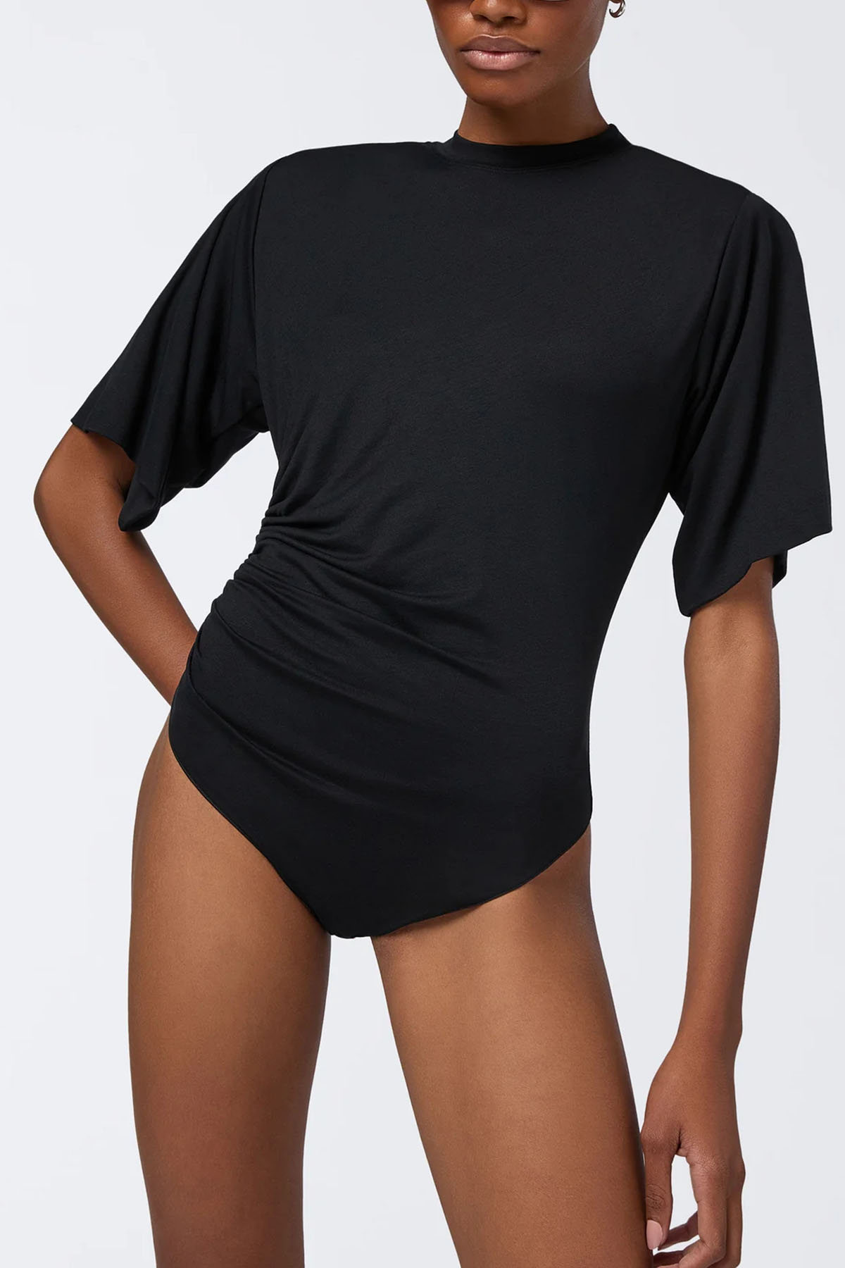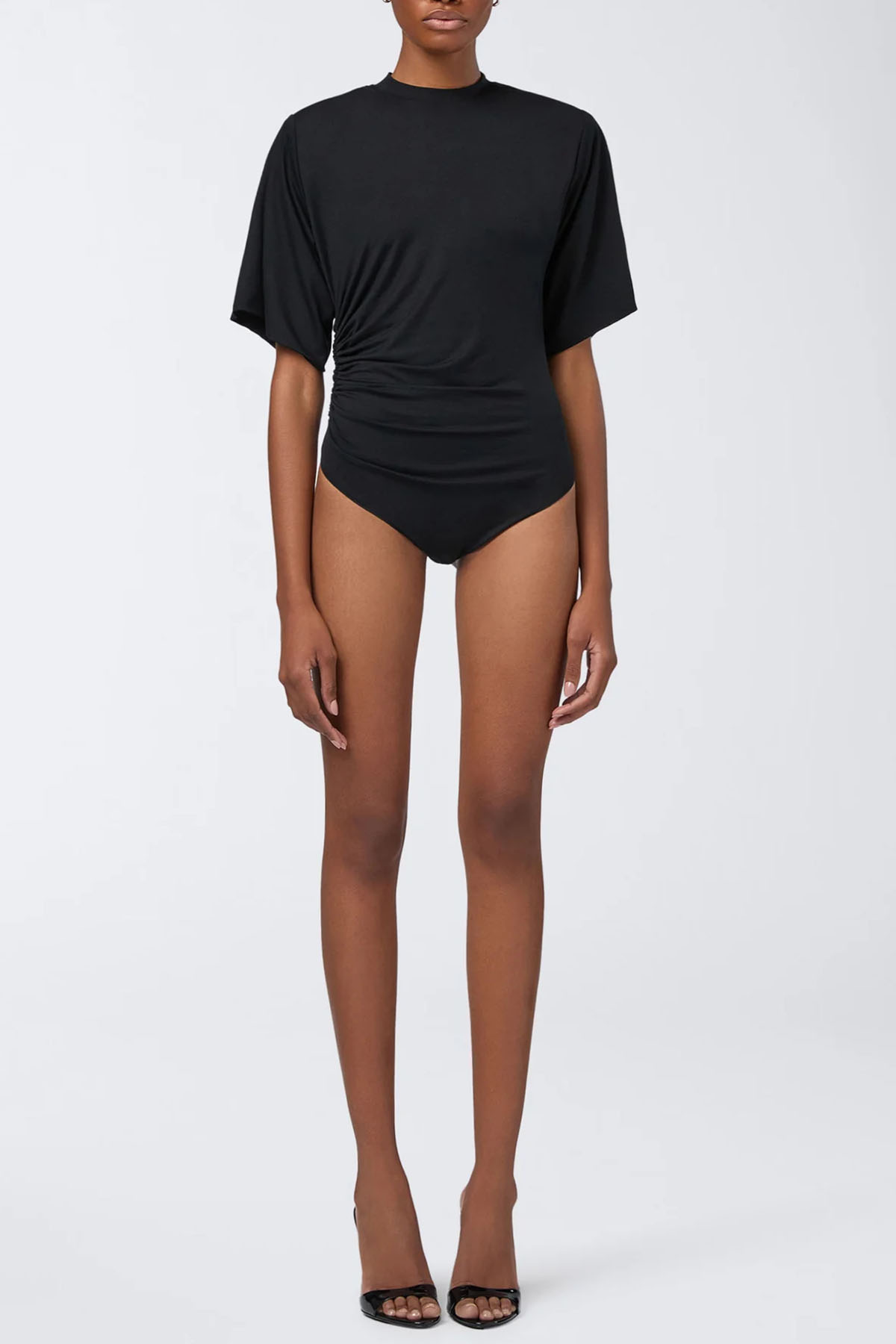 modello realizzato in jersey, colore nero, girocollo, maniche corte, spalle imbottite, dettaglio arricciato sul lato, design aderente.