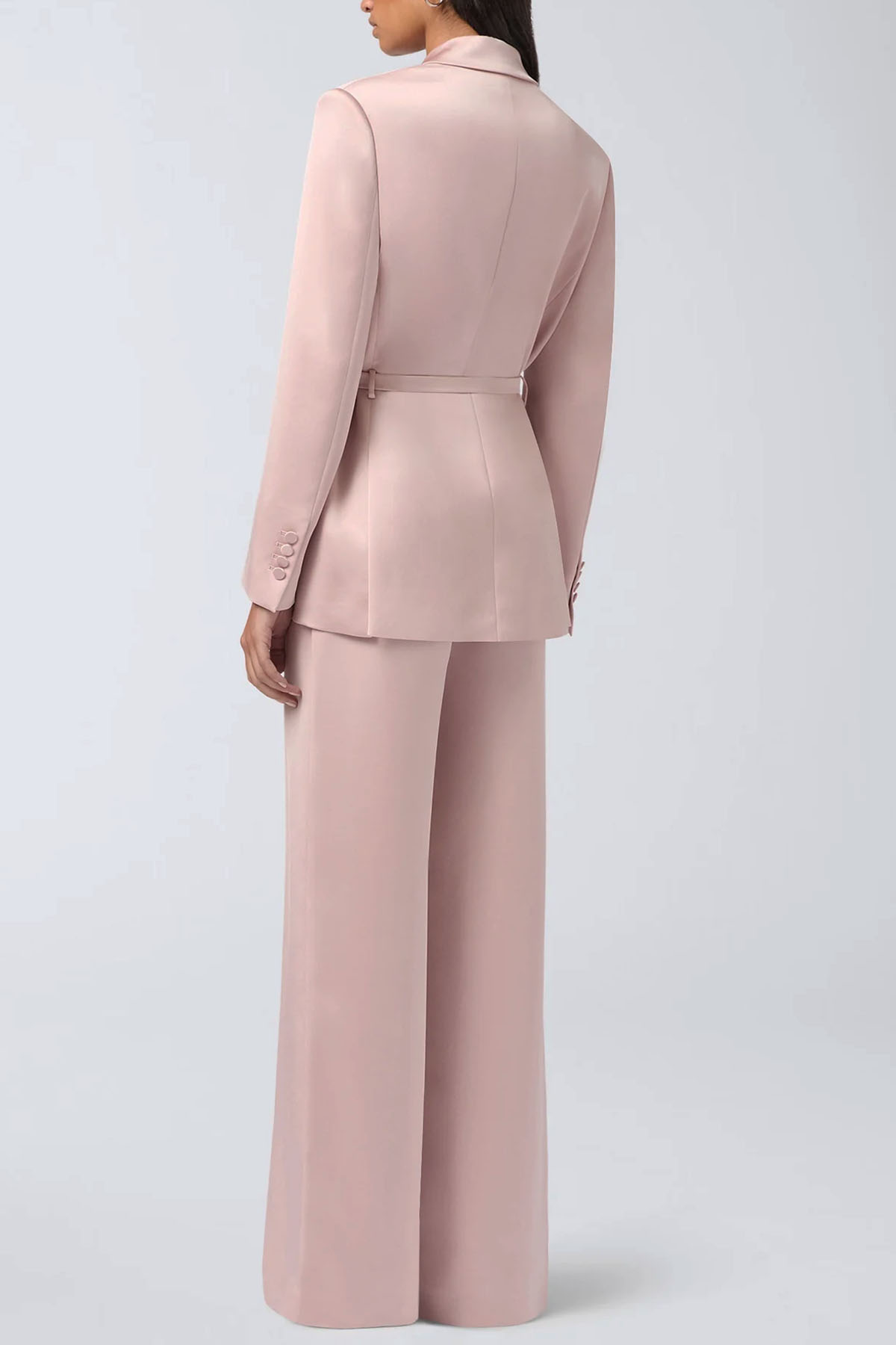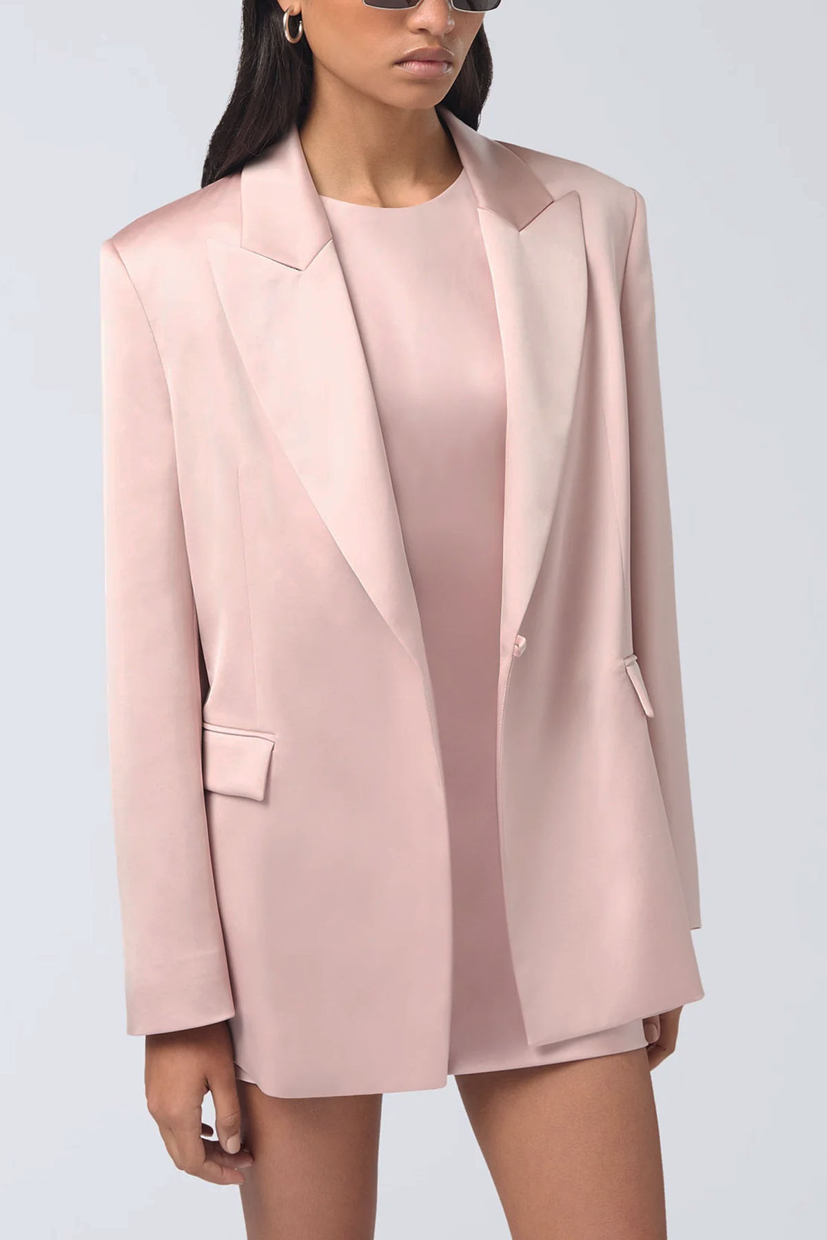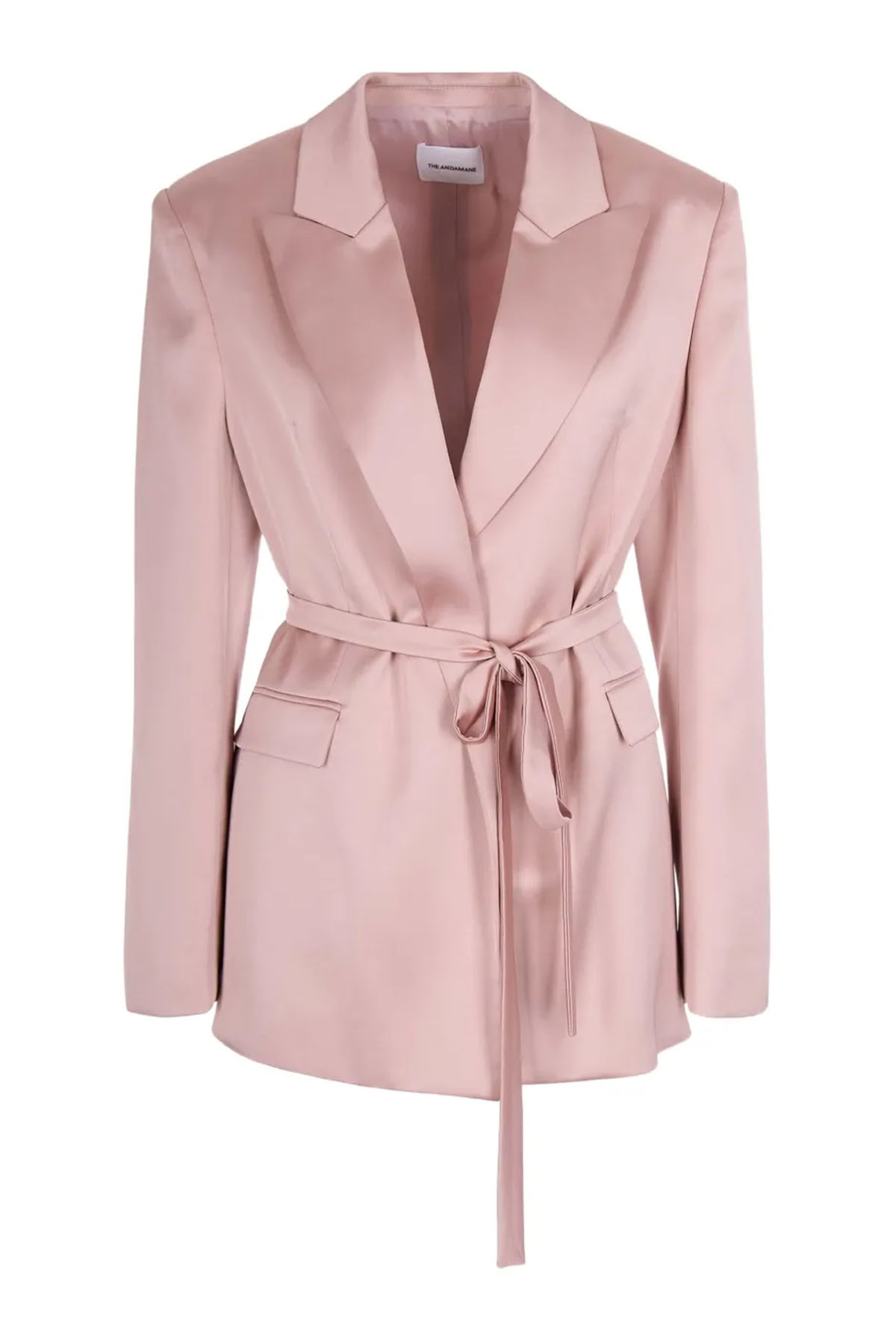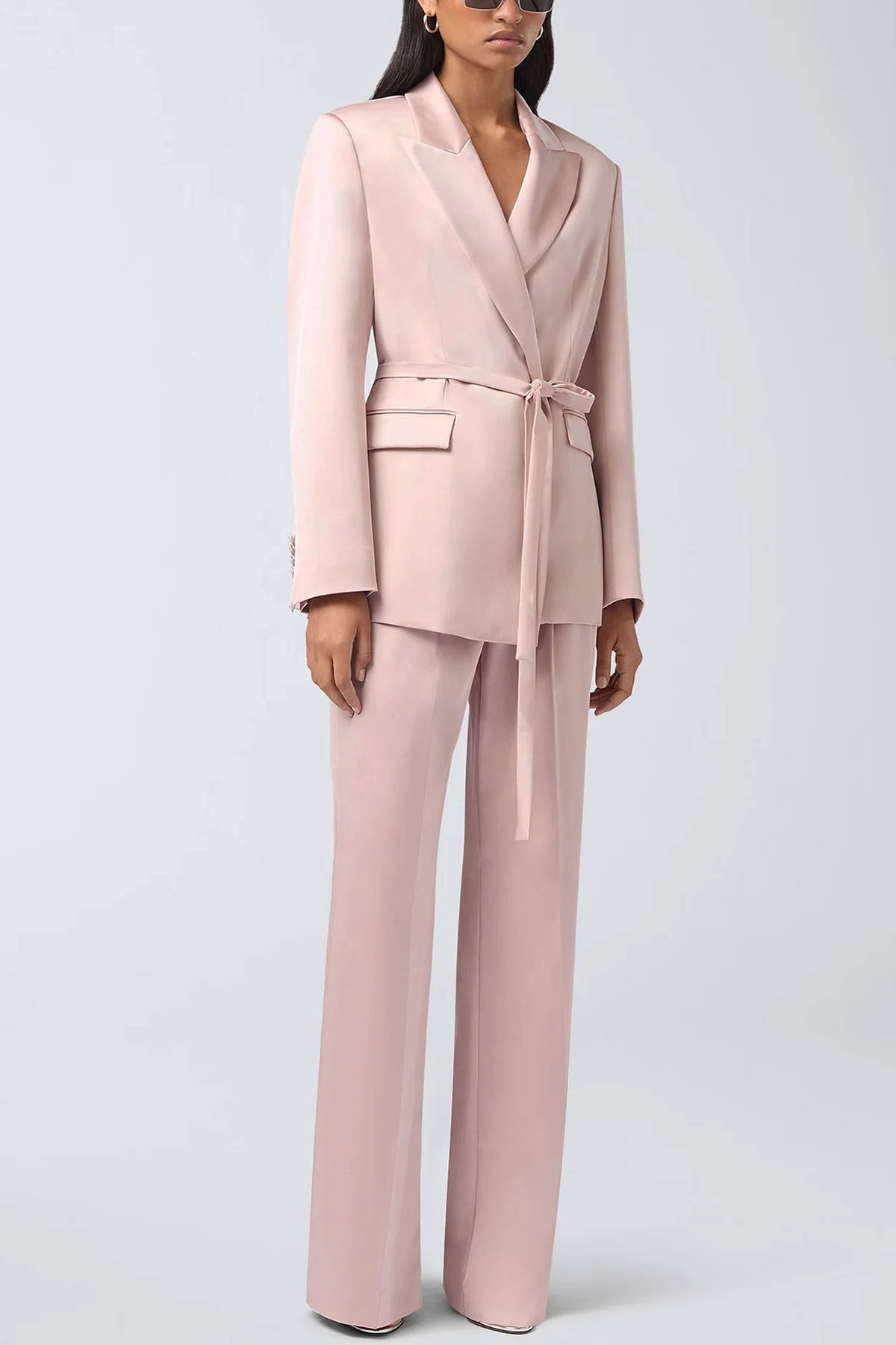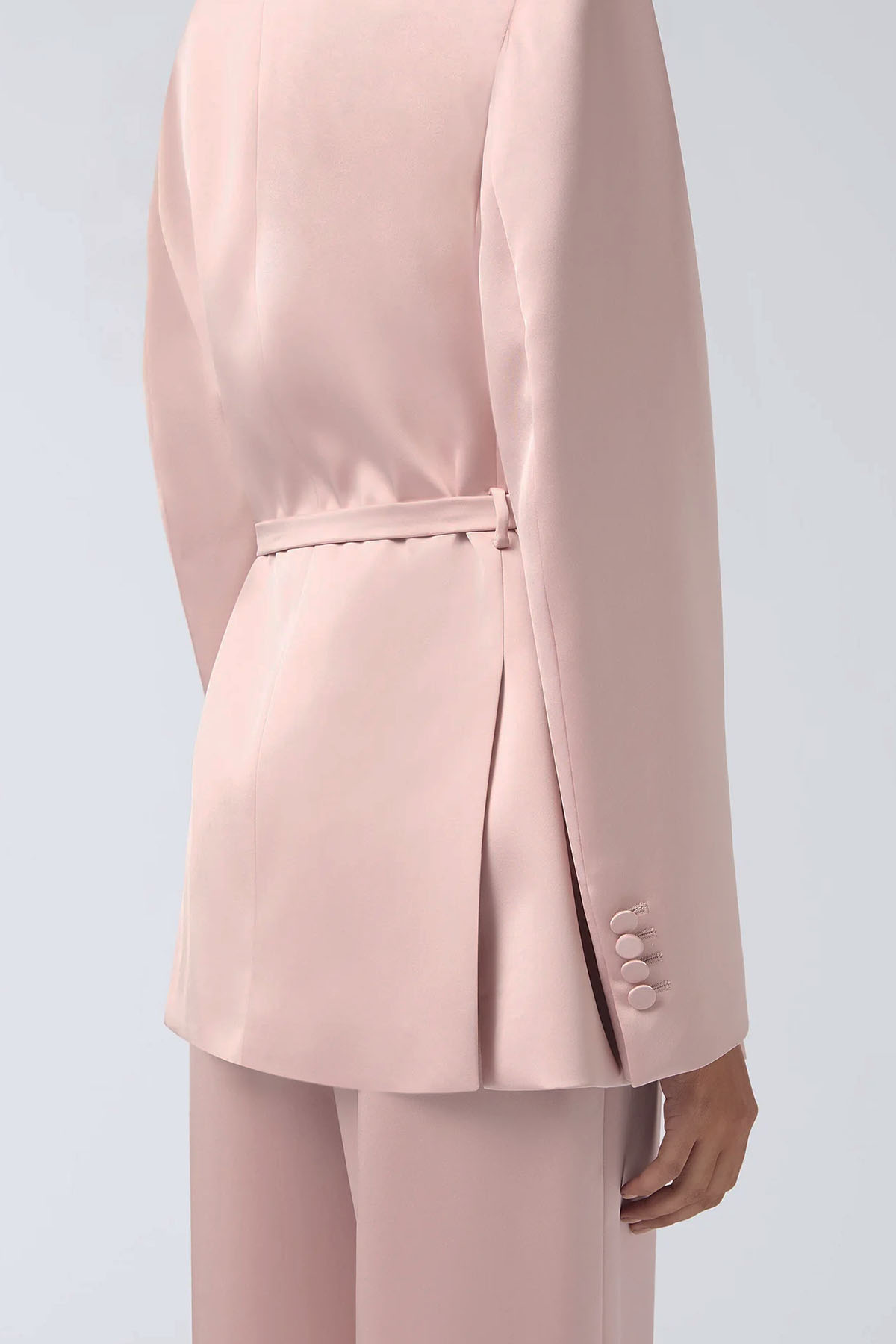 giacca di colore rosa, realizzata in raso liquido, revers a punta, manica lunga, spalline imbottite, polsini con bottoni, tasche a filetto con patta, cintuta in vita regolabile e rimovibile.
