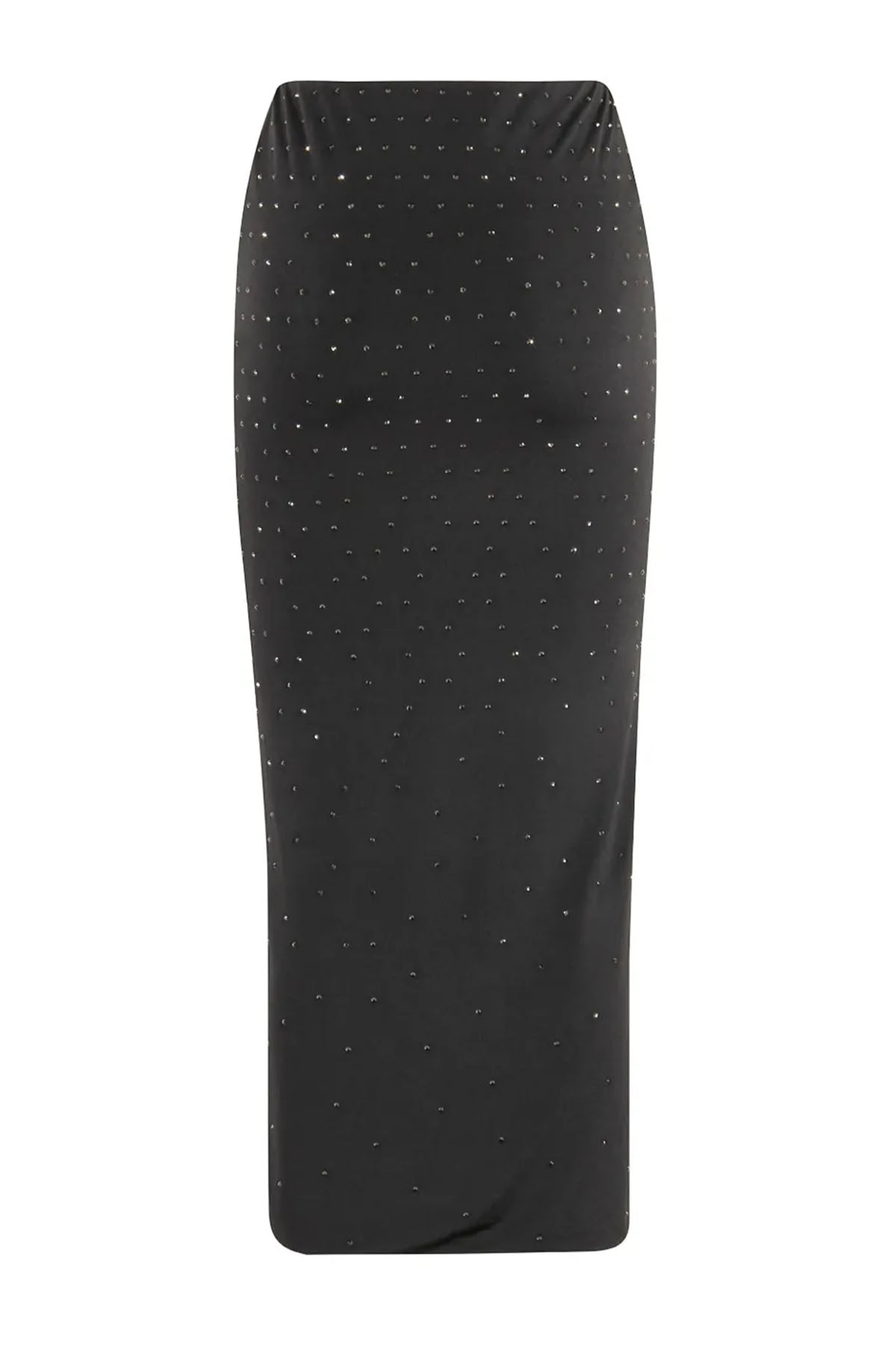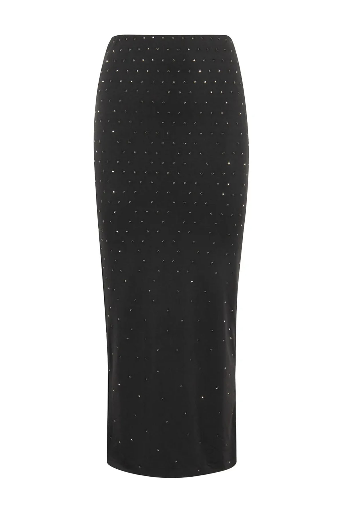 Modello con cristalli applicati, chiusura posteriore con zip nascosta, design aderente, lunghezza alla caviglia.