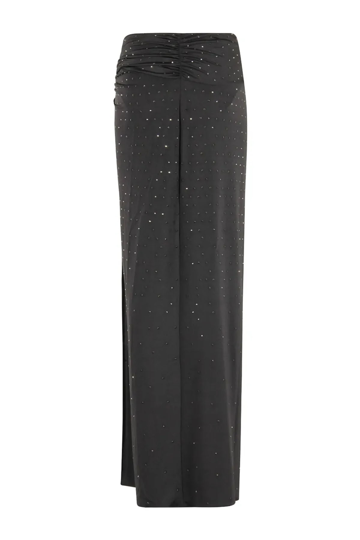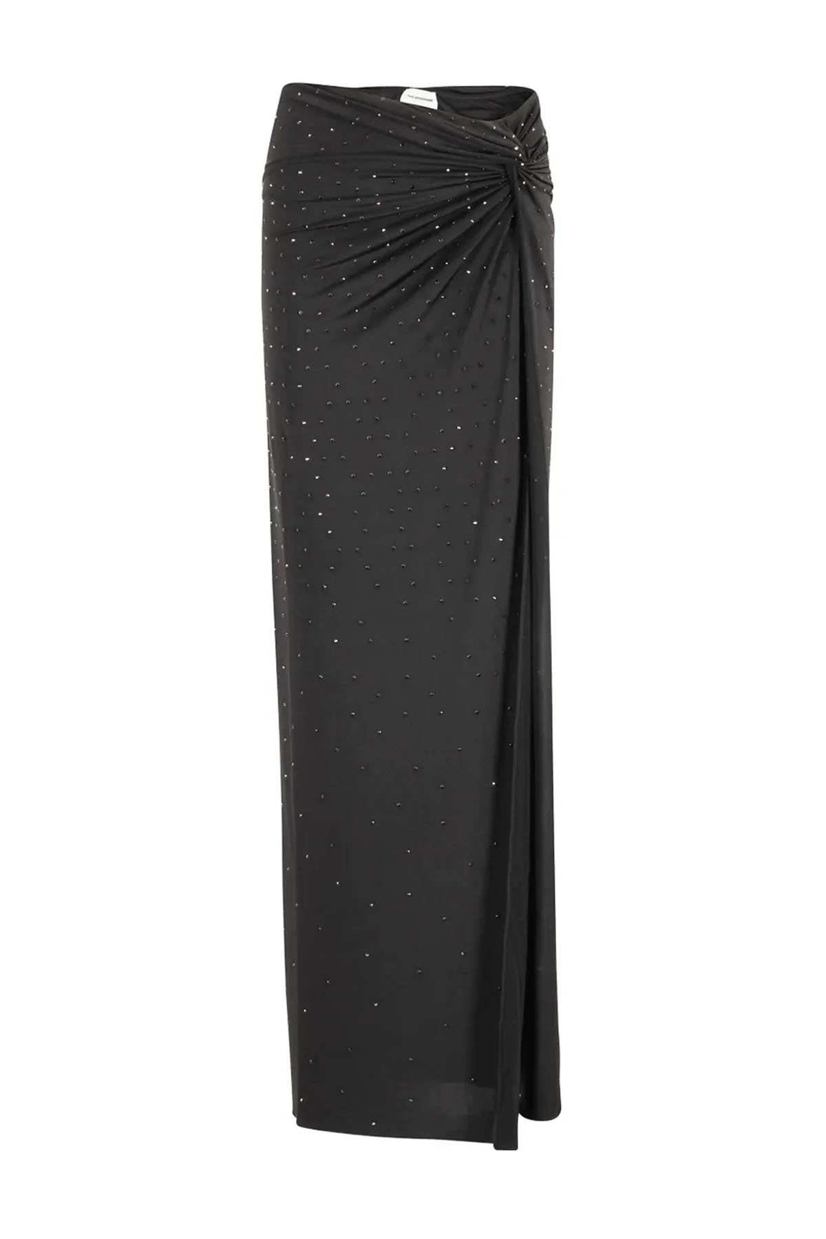 Modello con decorazione cristalli, dettaglio con nodo, spacco laterale profonto, pantaloncini incorporati nella sottana, design lungo.