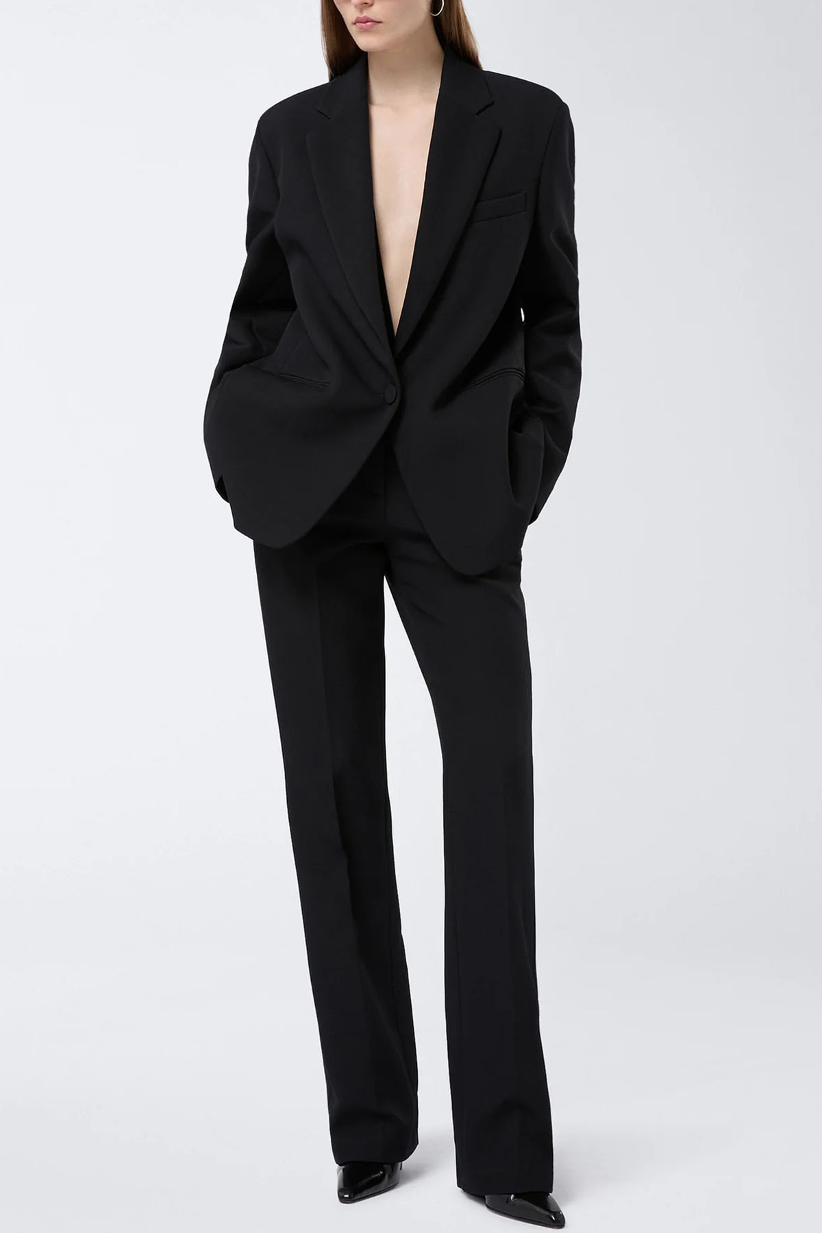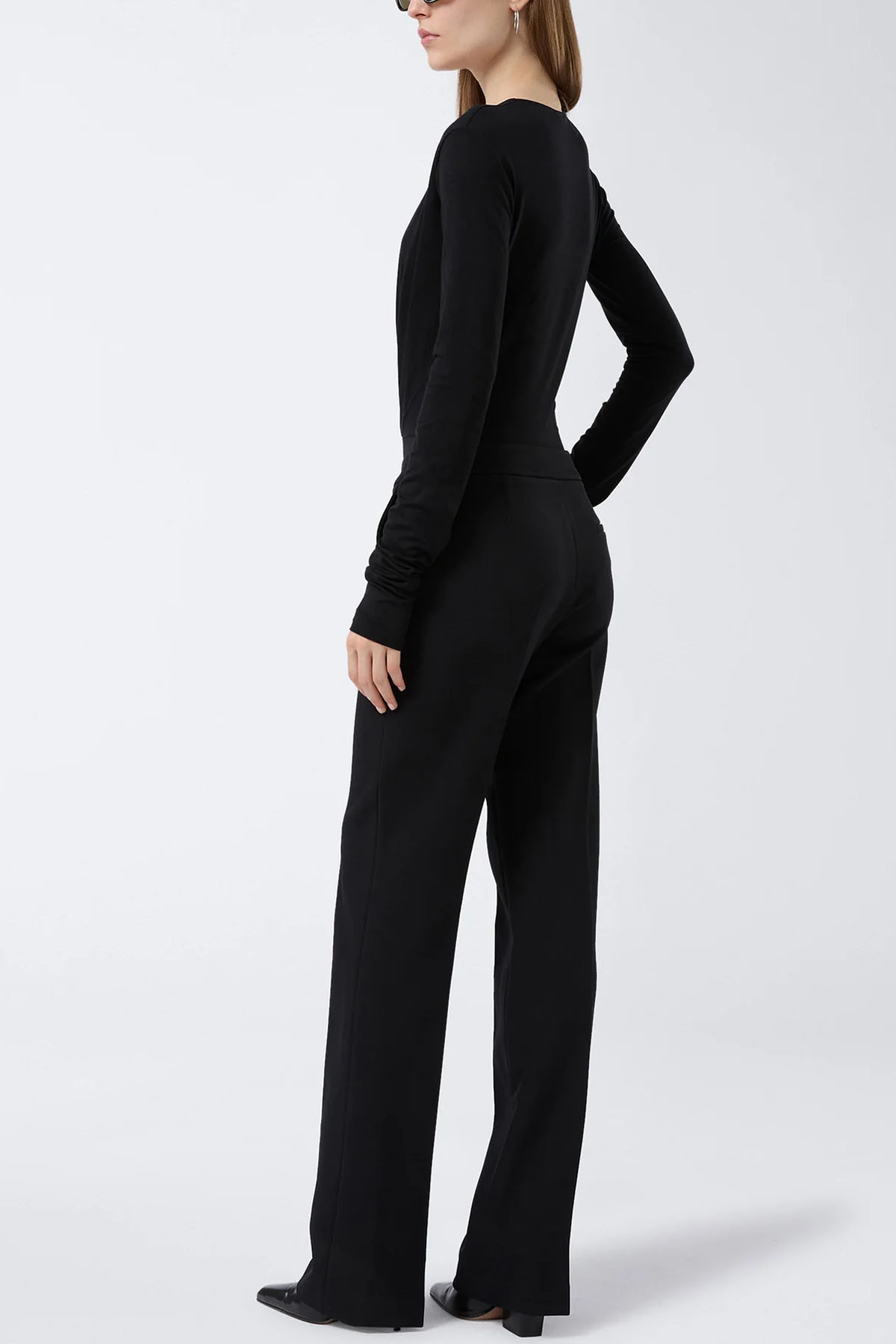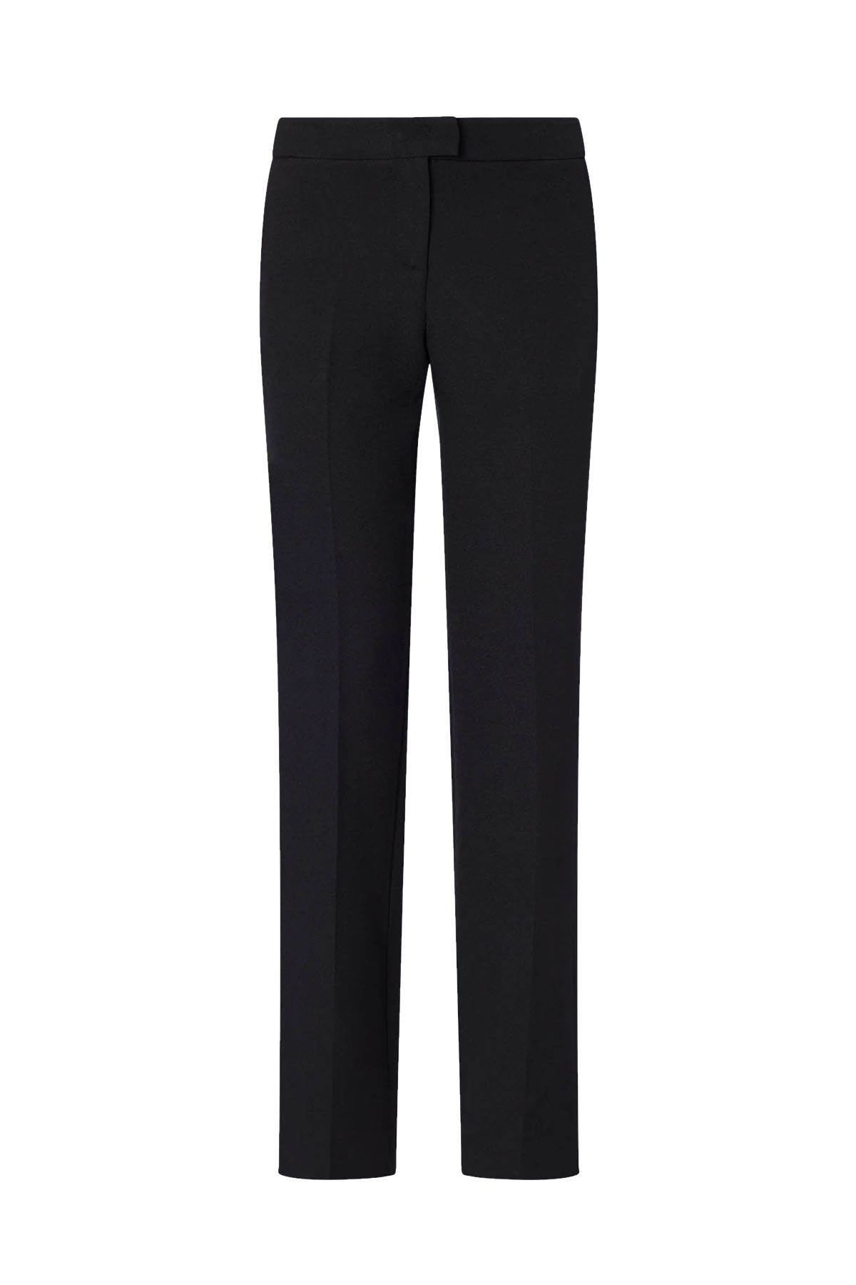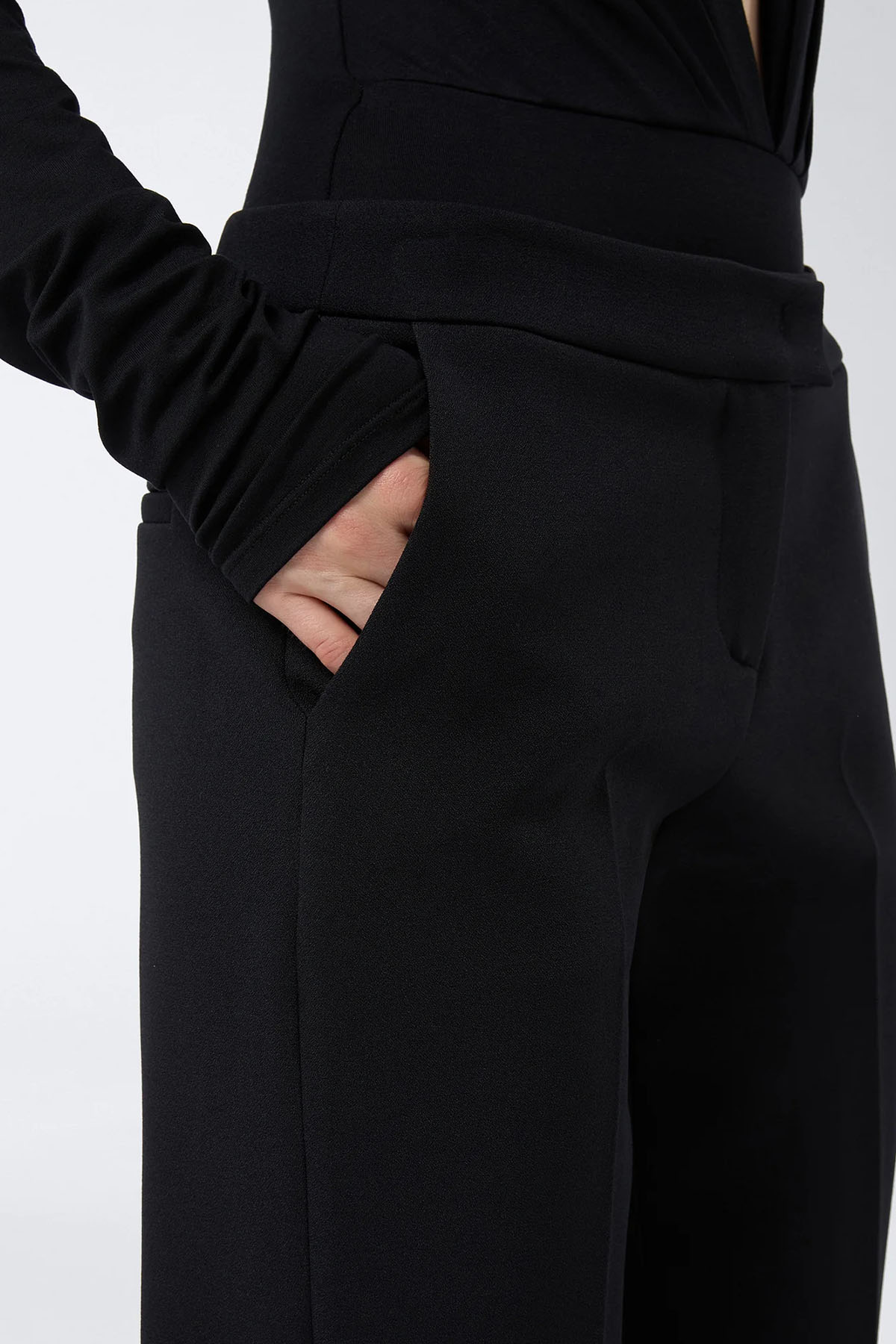 Modello dritto, sono realizzati in crêpe tecnico nero, chiusura frontale con zip, gancio e bottone, tasche laterali a fessura sul davanti per una maggiore praticità.