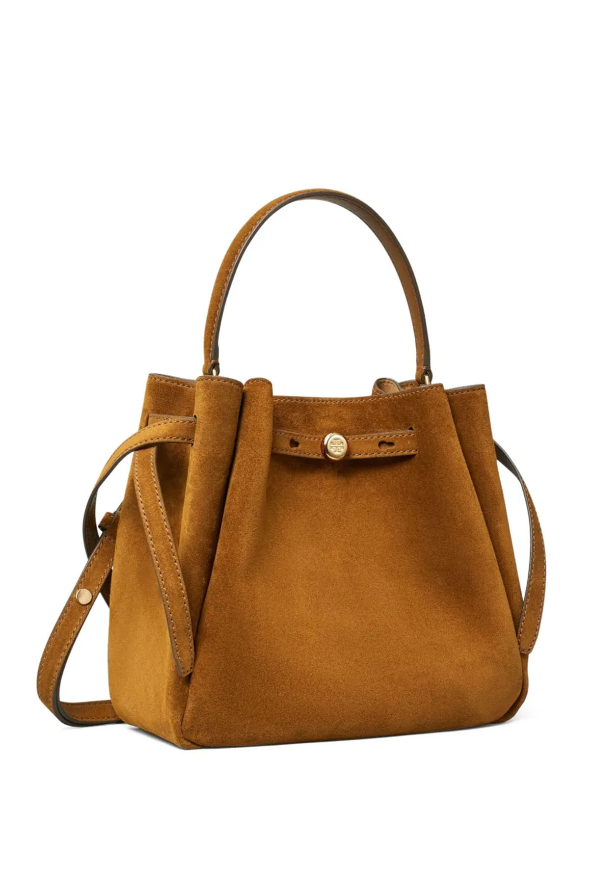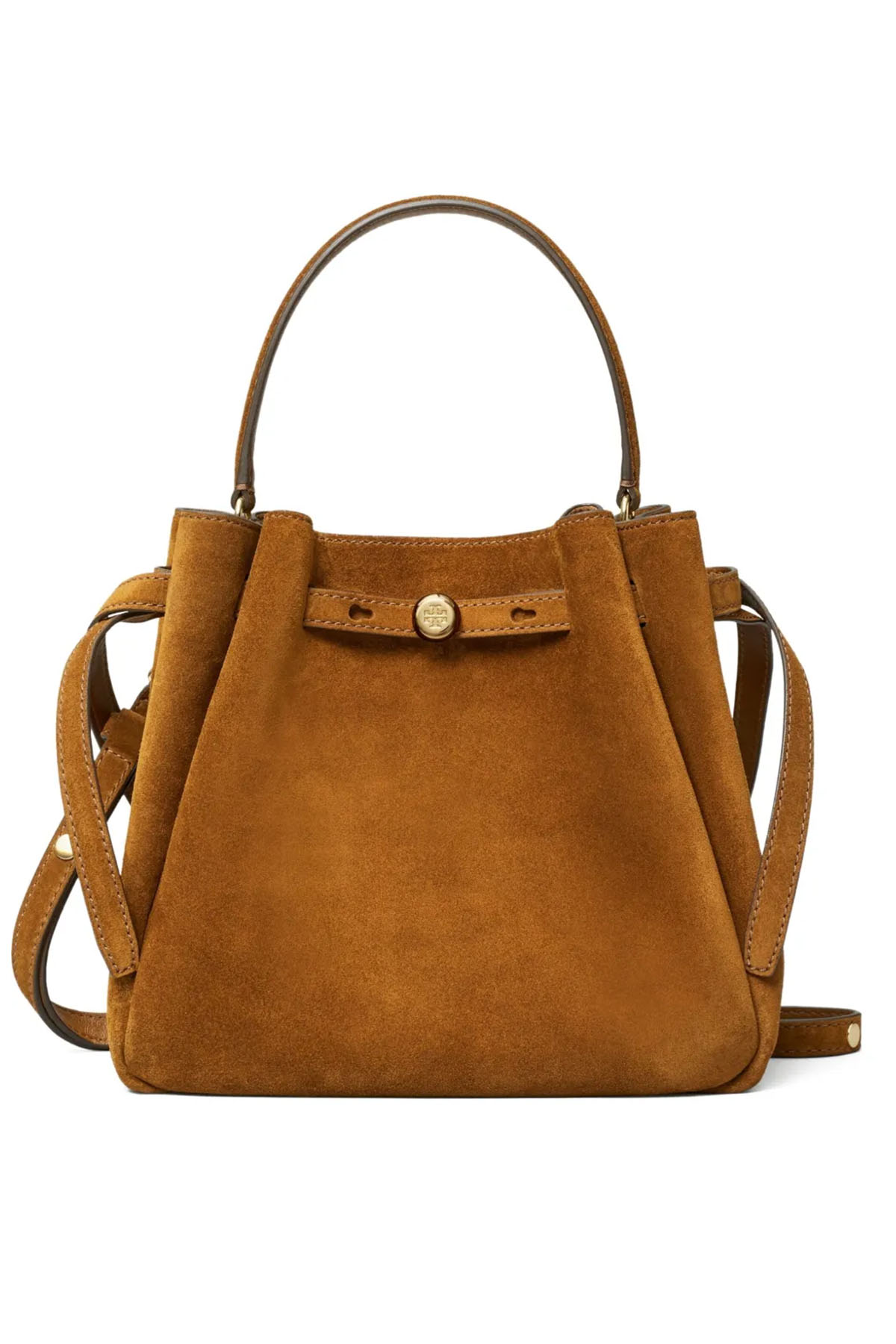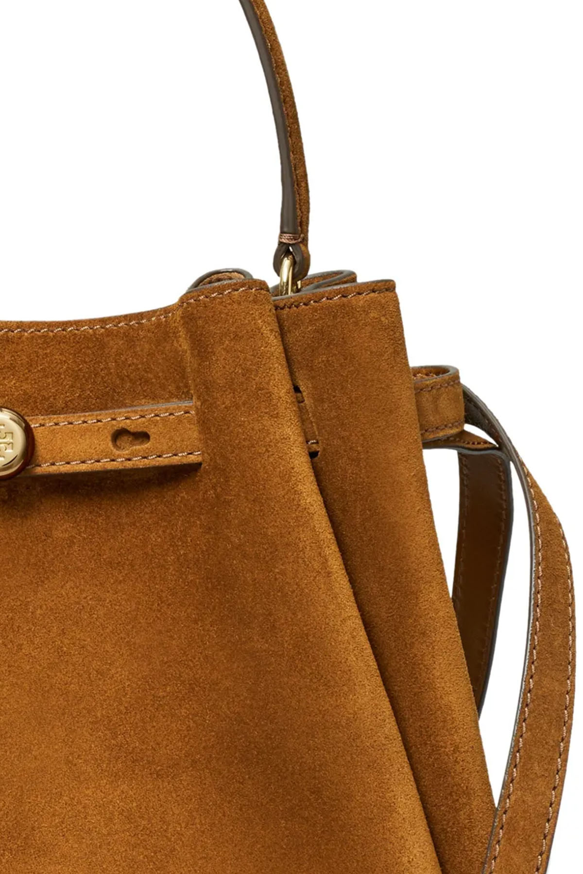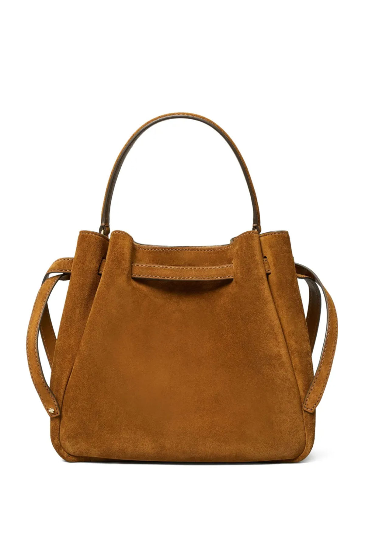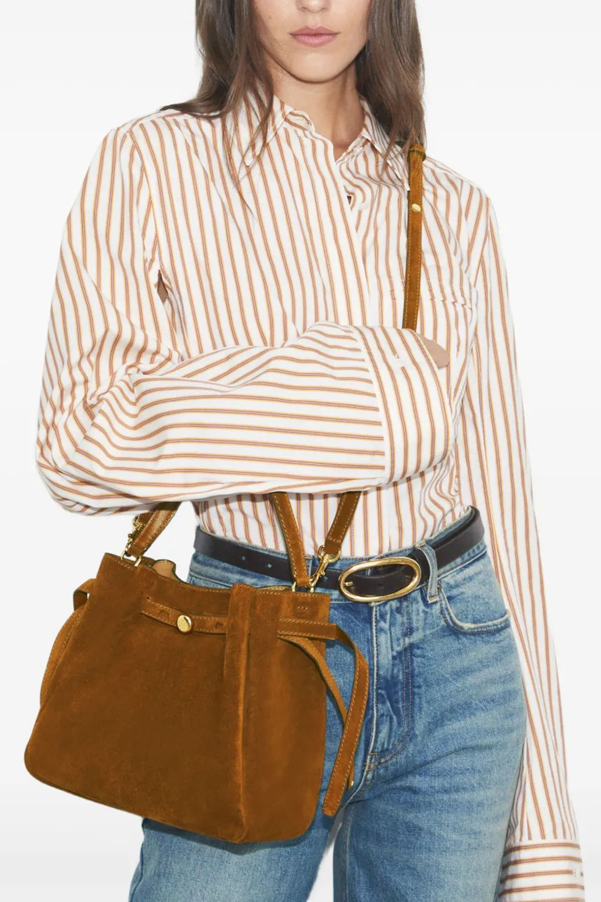 Modello in suede; chiusura con bottoni magnetici; cinturino con chiusura a bottoncino, manico superiore di 13,5 cm; tracolla regolabile e rimovibile di 33 cm, estensibile fino a 55 cm, 1 tasca interna. Sacchetto protettivo incluso.