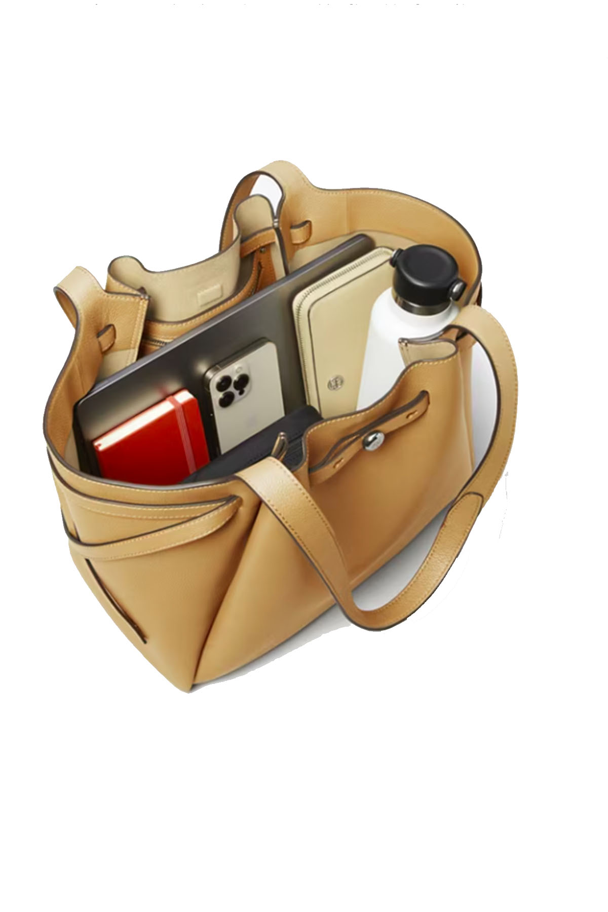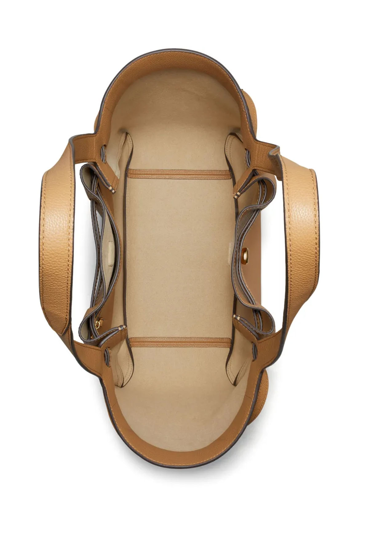 Modello in pelle martellata, chiusura con bottoni magnetici; cinturino con chiusura a bottoncino, altezza manici superiori: 31 cm, tasca interna pendente con zip. Sacchetto protettivo incluso