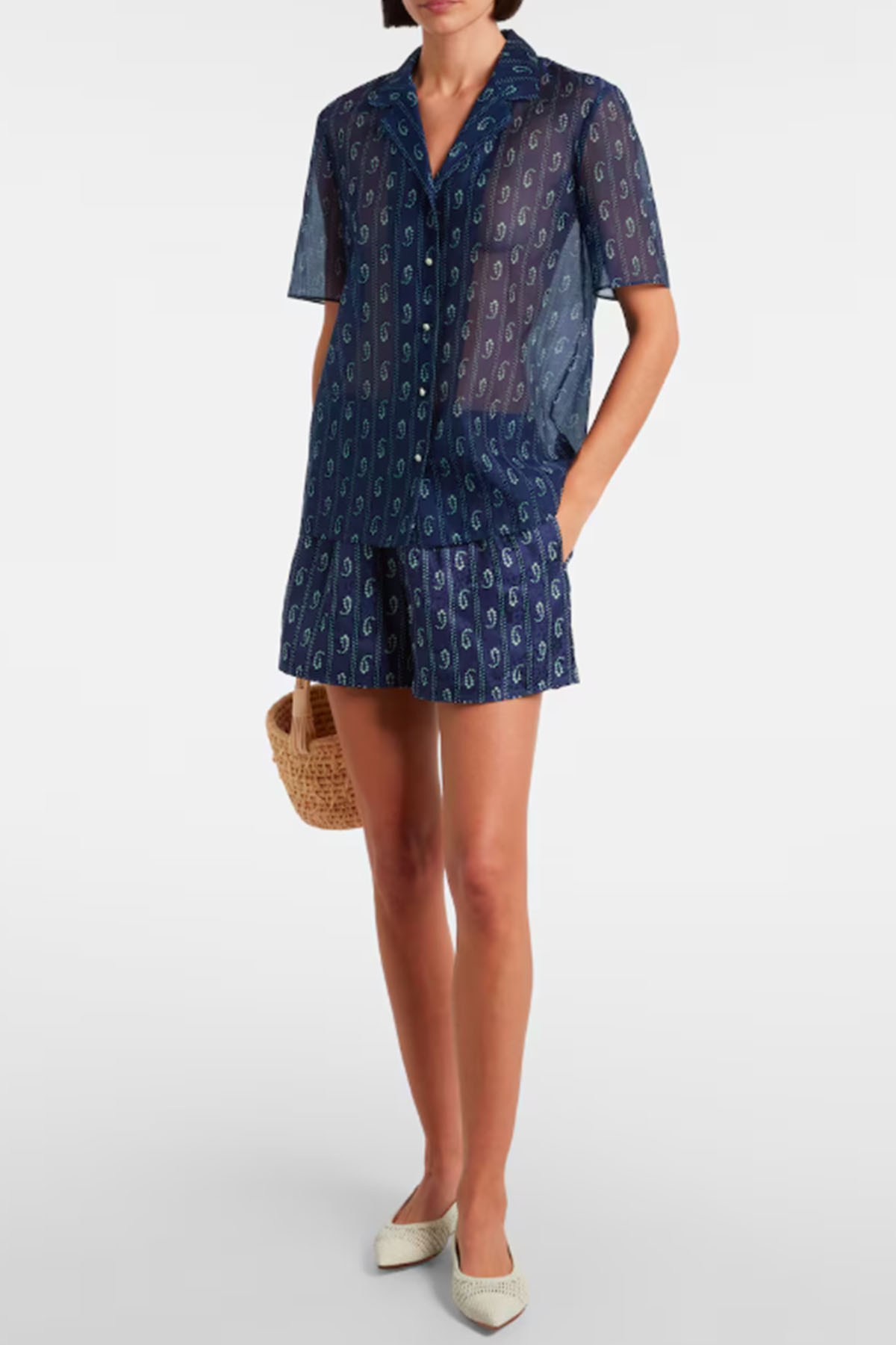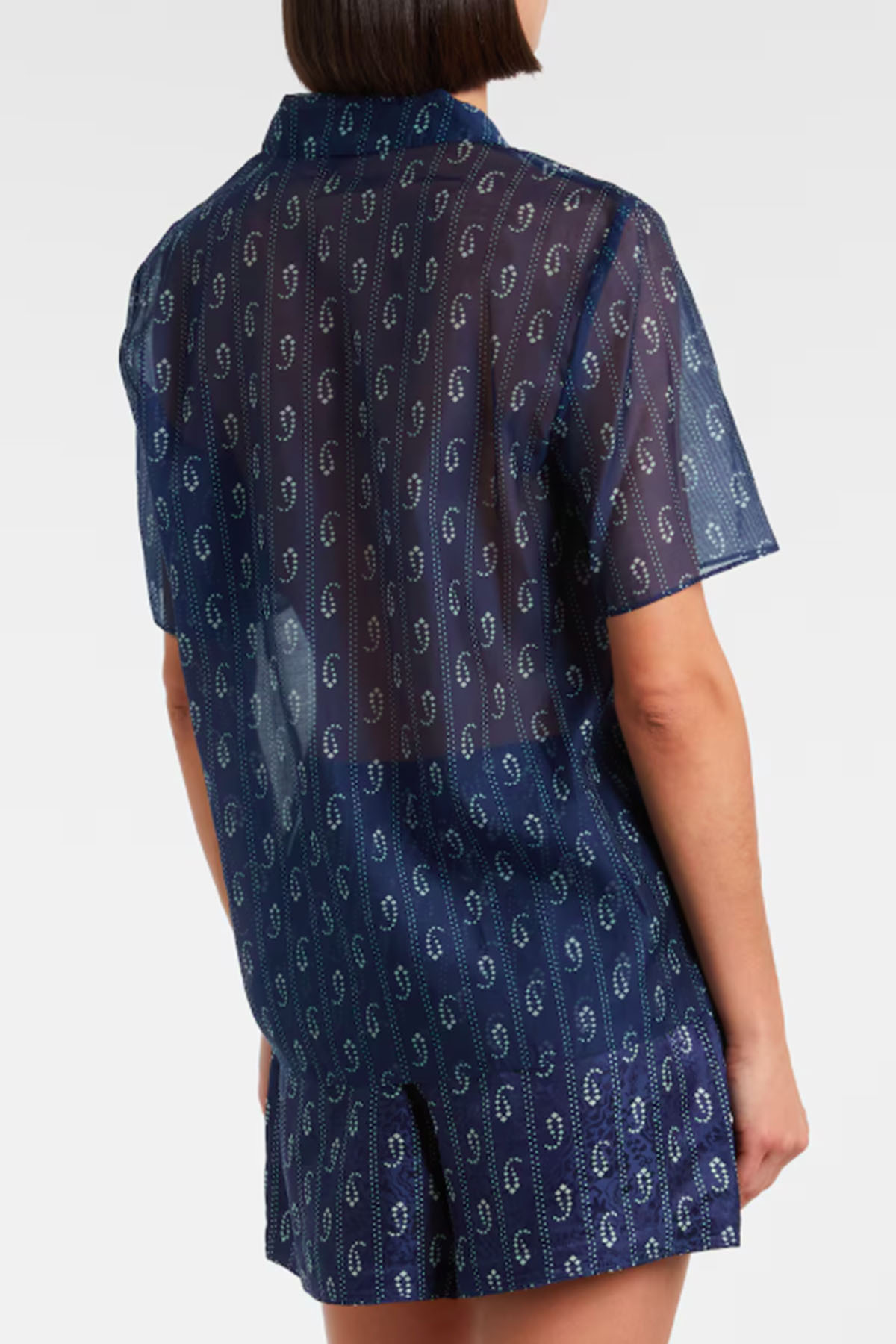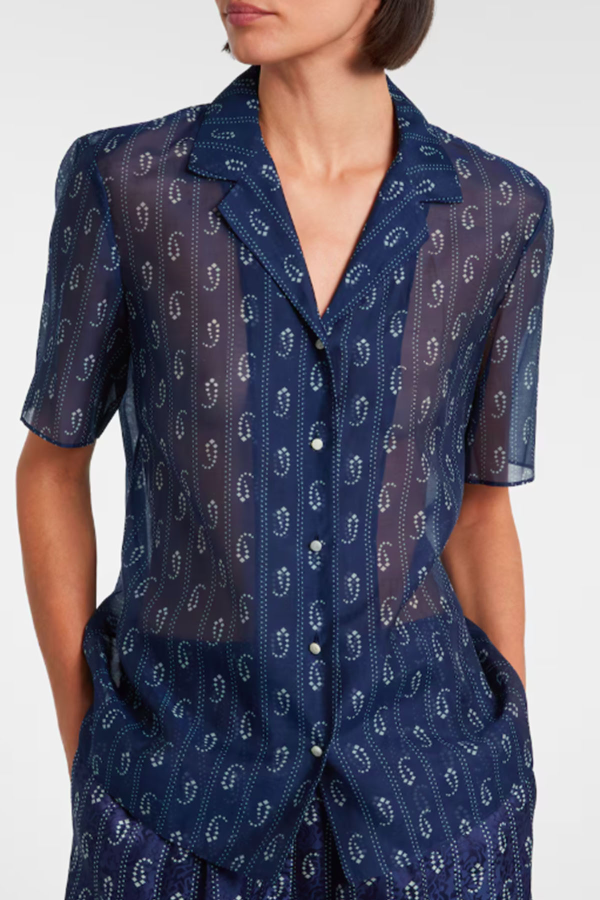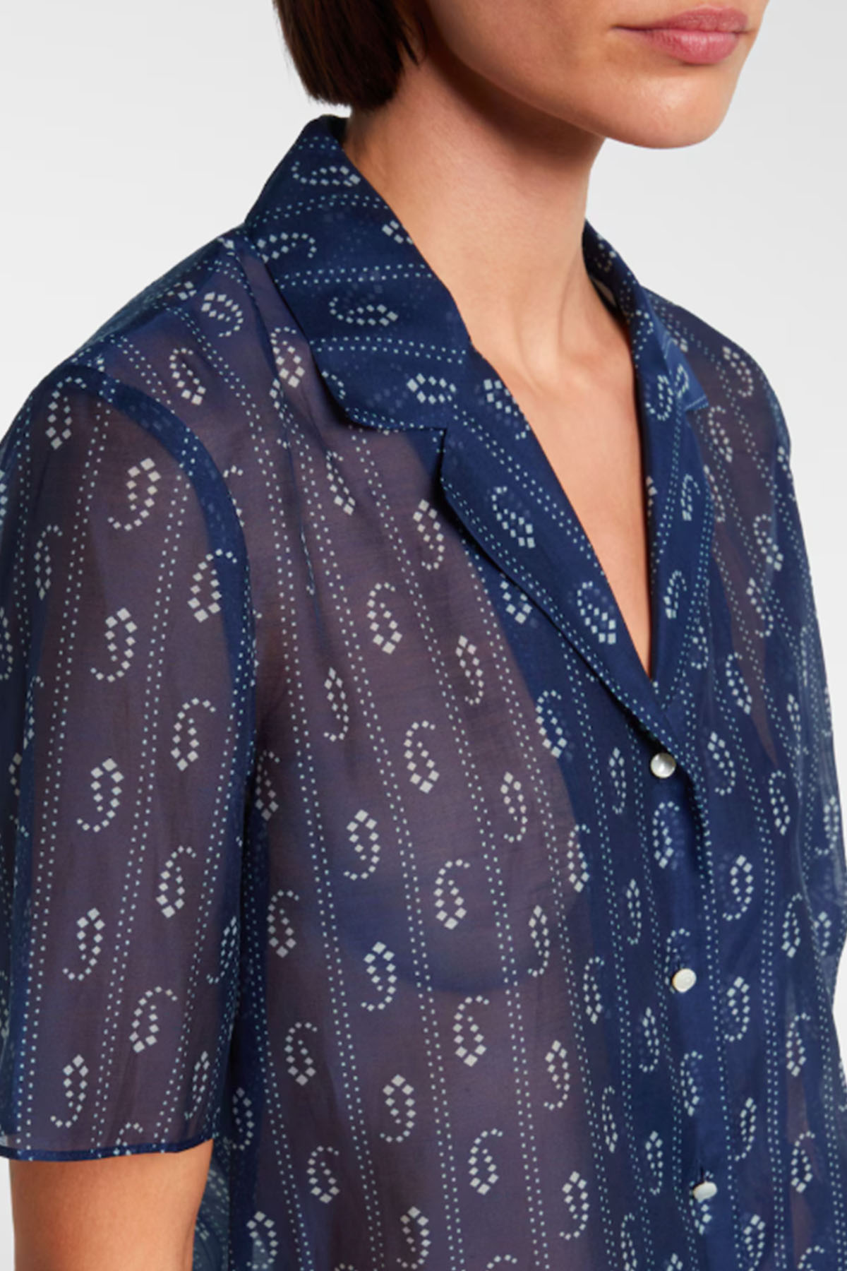 Modello con colletto, scollo a V, chiusura con bottoni sul davanti, profili in seta a contrasto su colletto, abbottonatura frontale, manica corta.