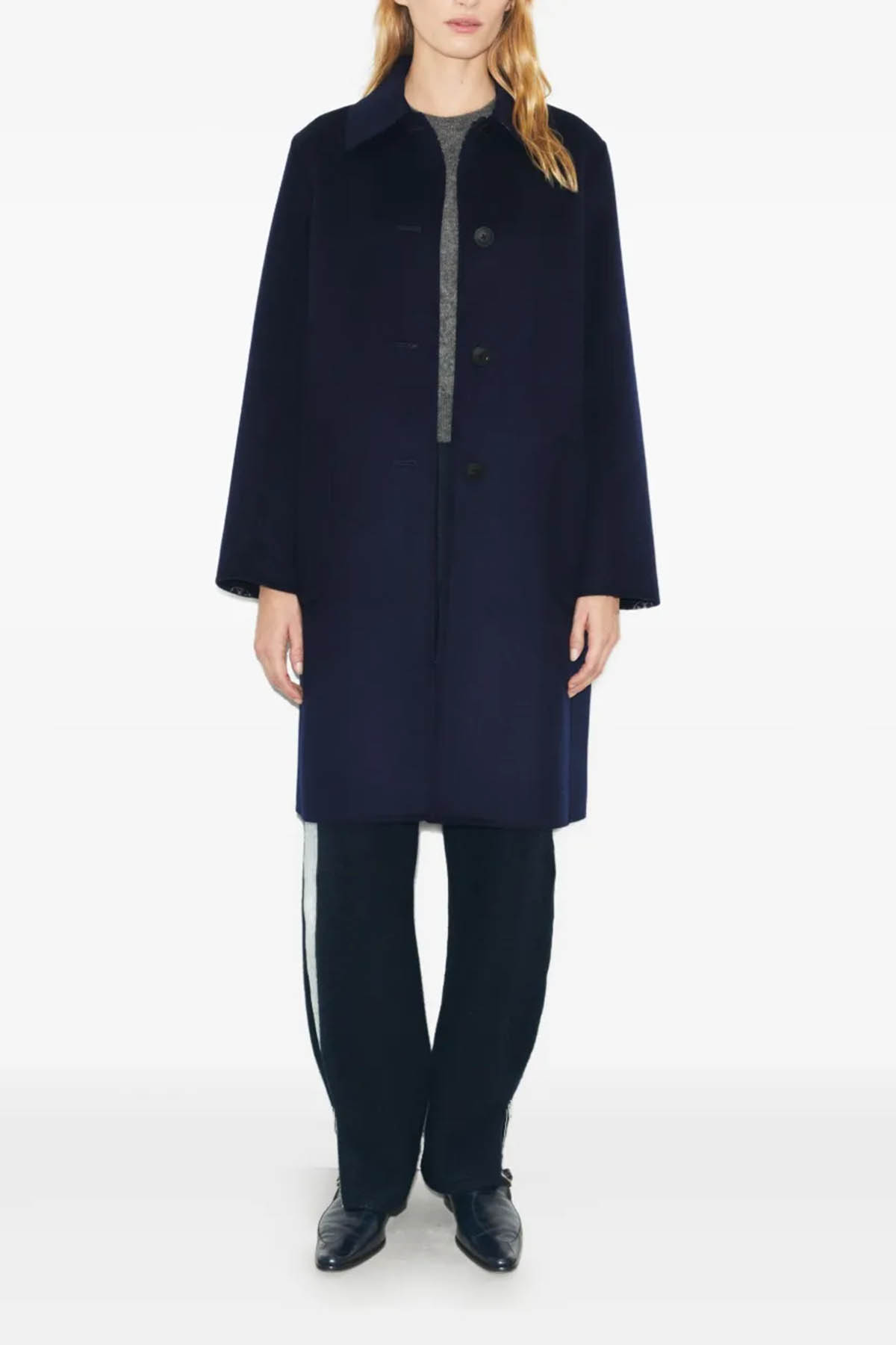 Modello reversibile realizzato in lana double face, con un lato monocolore e laltro decorato con il motivo T Monogram, vestibilità ampia, tasche applicate sia interne che esterne, maniche lunghe, colletto, chiusura frontale con bottoni.