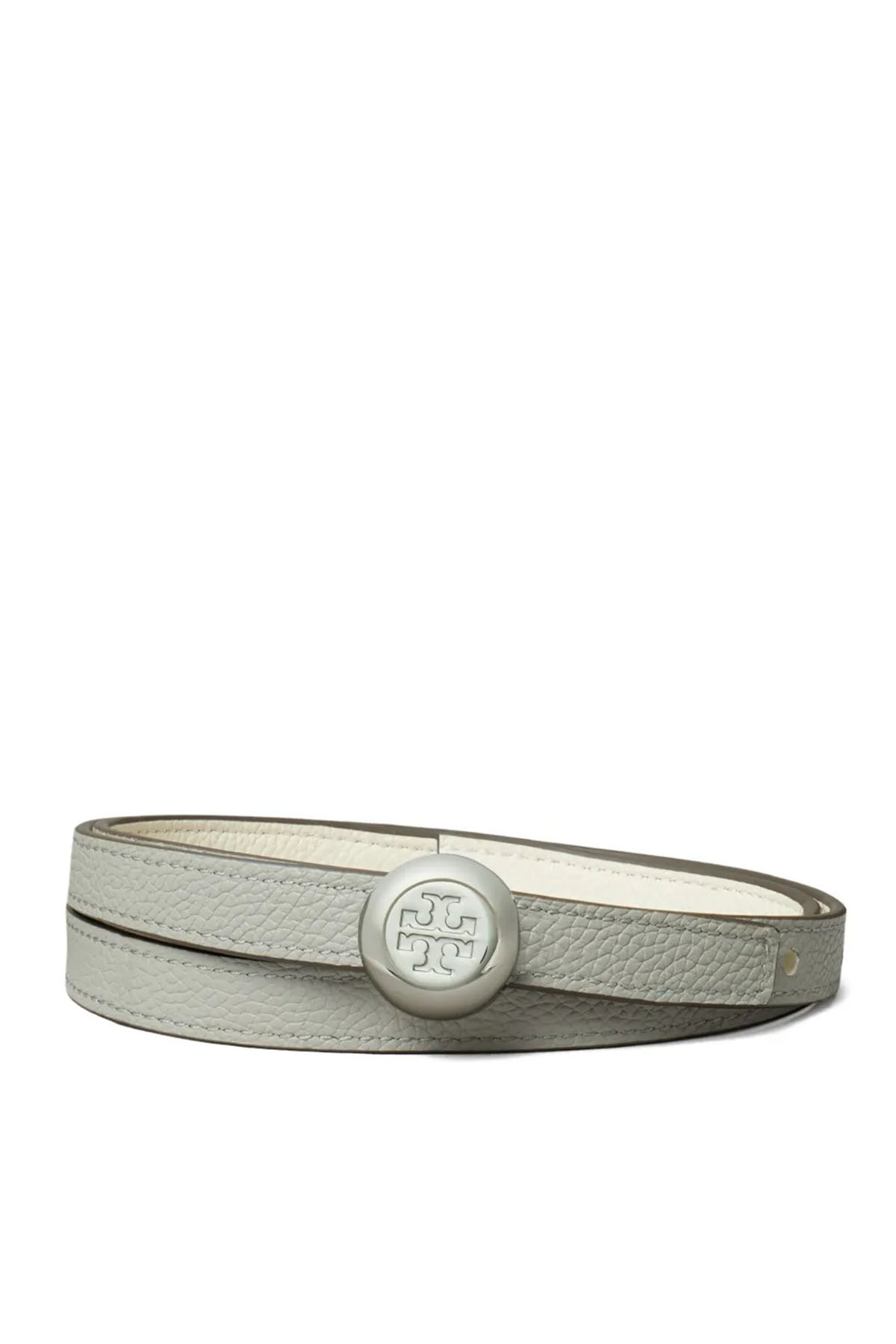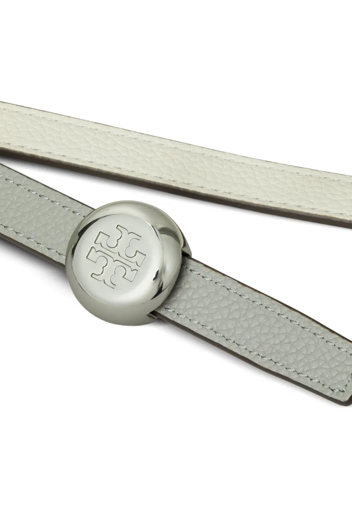 Modello in pelle martellata, fibbia con logo circolare e chiusura a bottone sul colletto, reversibile.