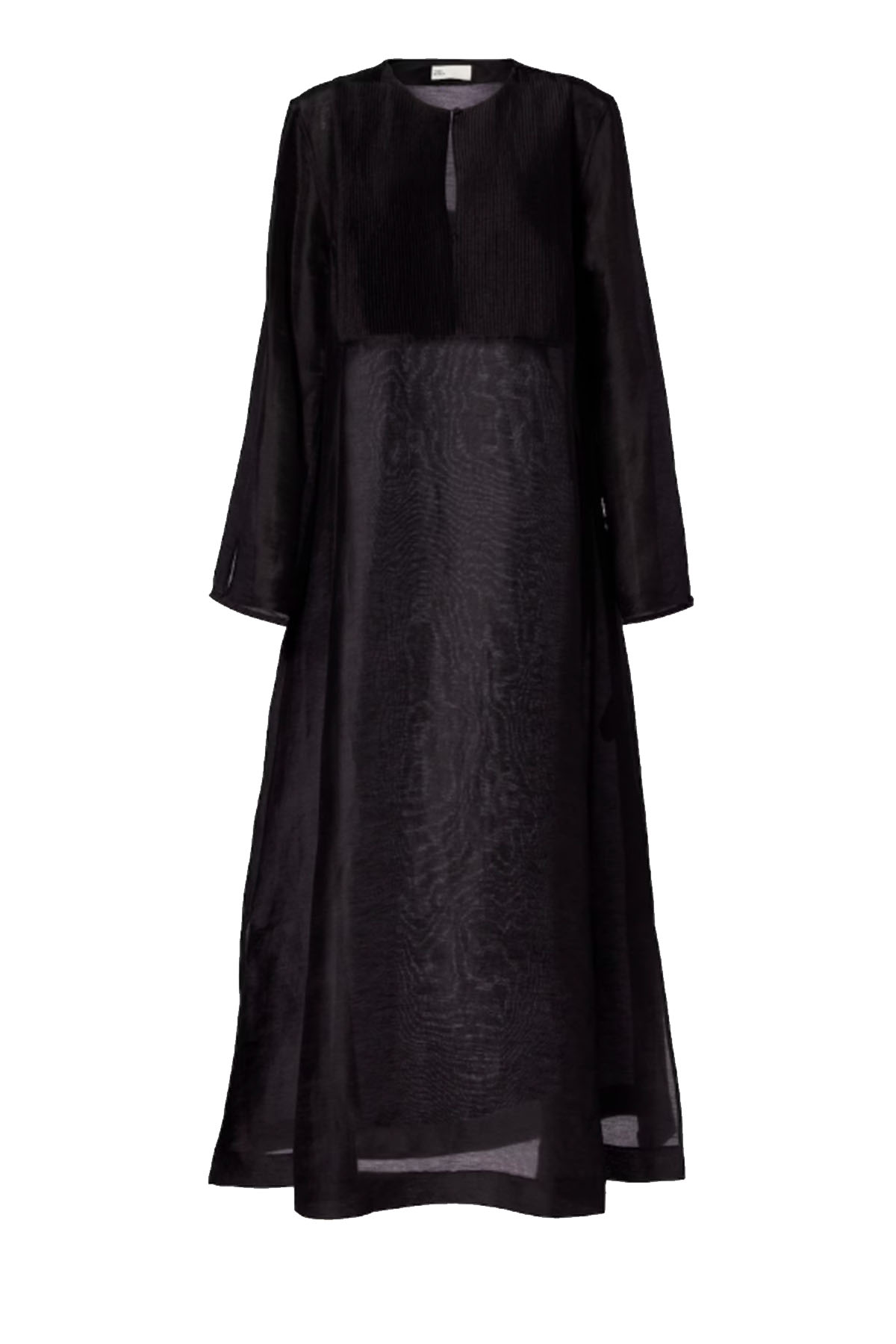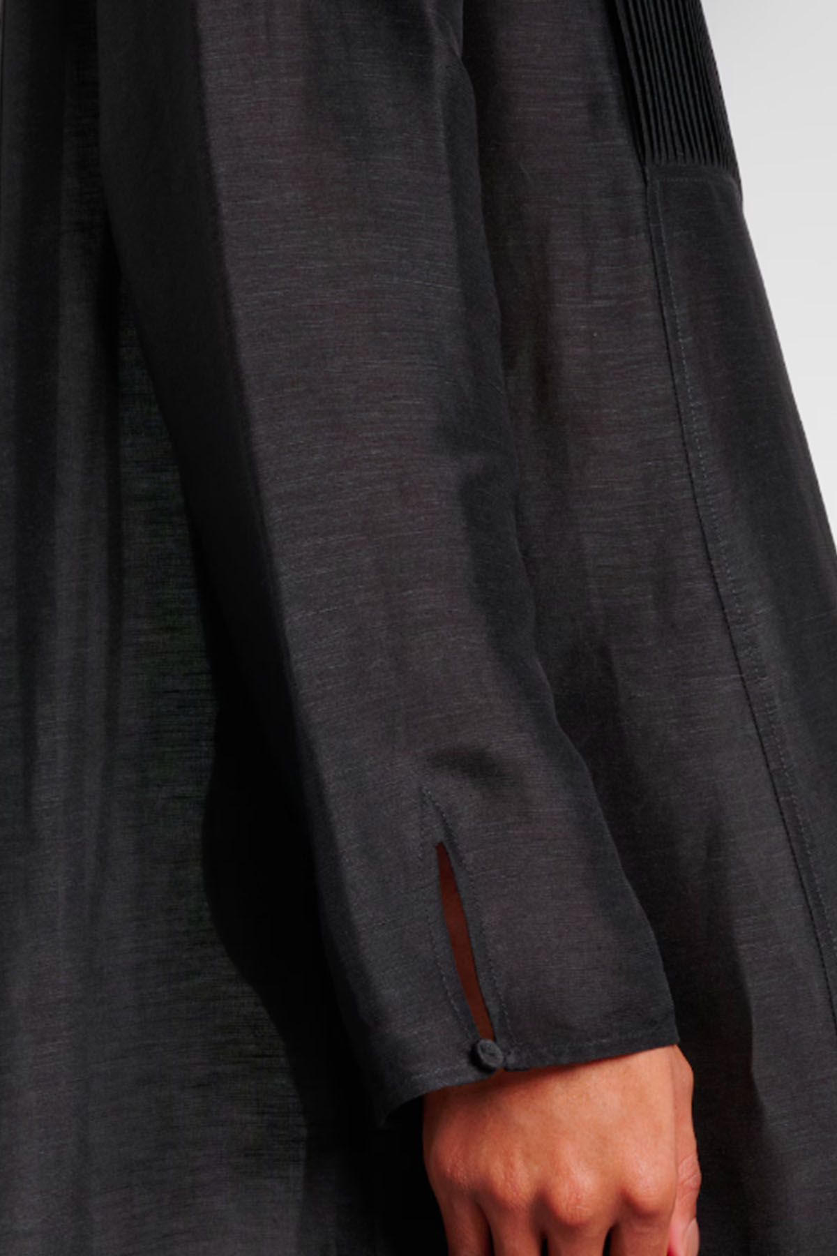 Modello con bottoni rivestiti in tessuto sullo scollo a fessura, sulle spalle e sui polsini,davantino a pieghe, spacchi laterali, scollo a giro, scollo a V, manica lunga, di media lunghezza.