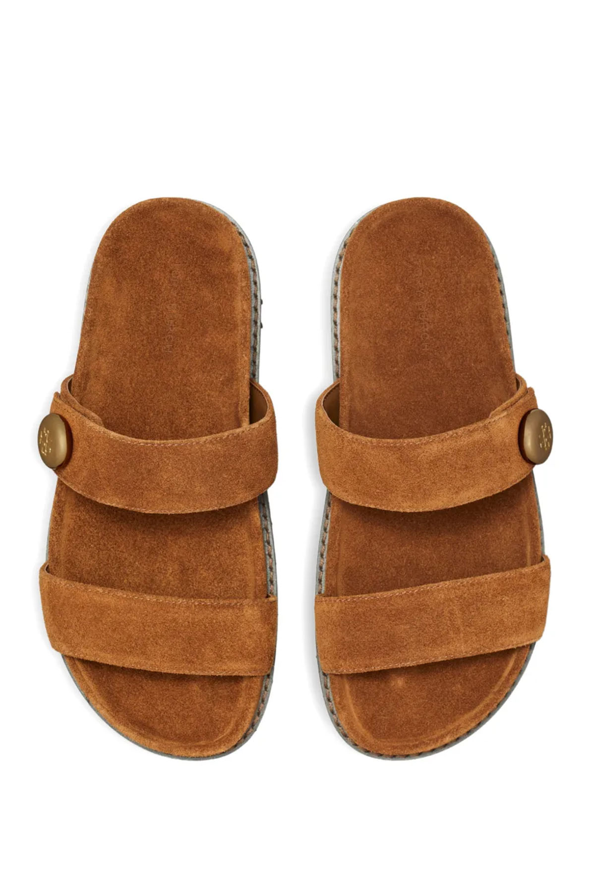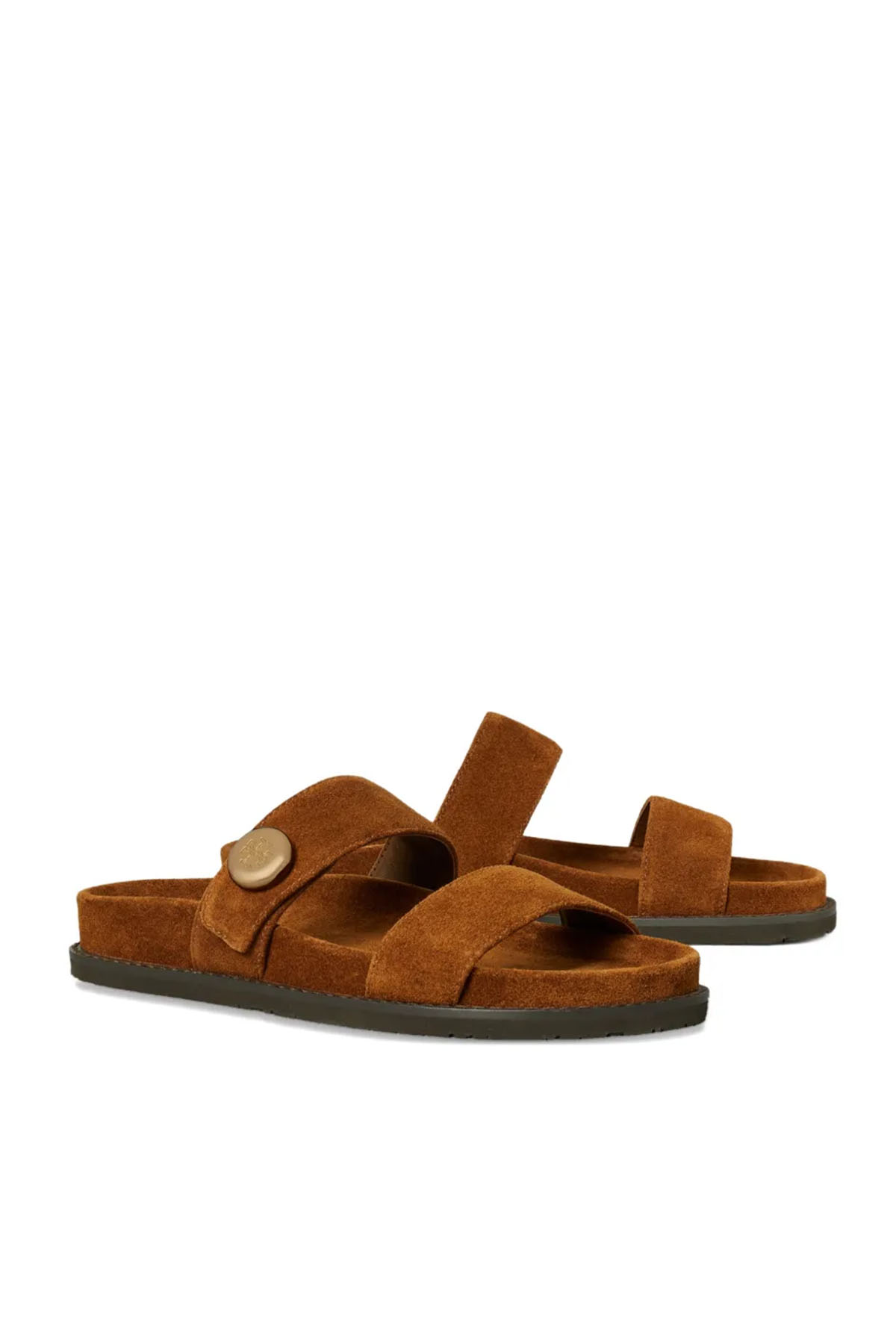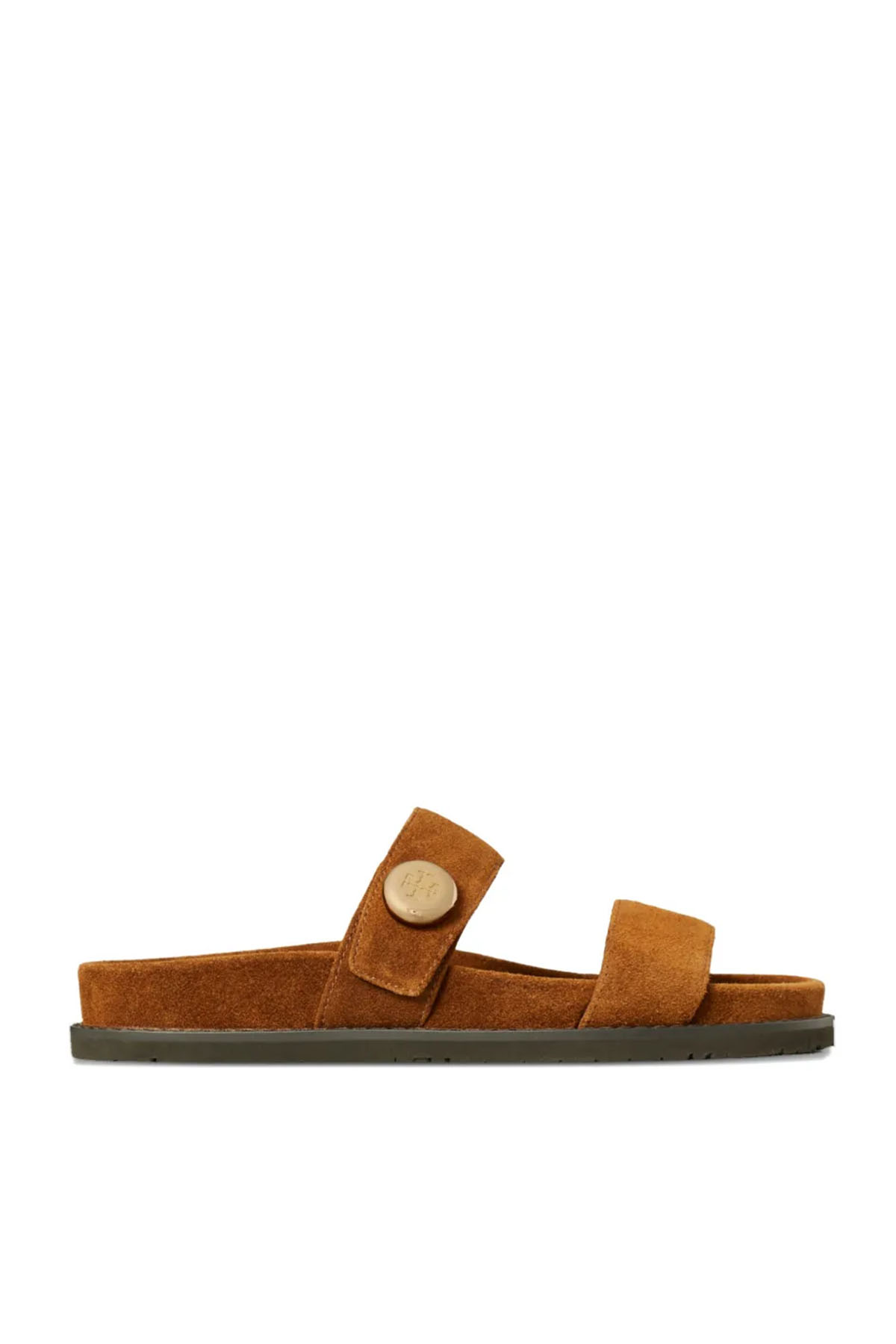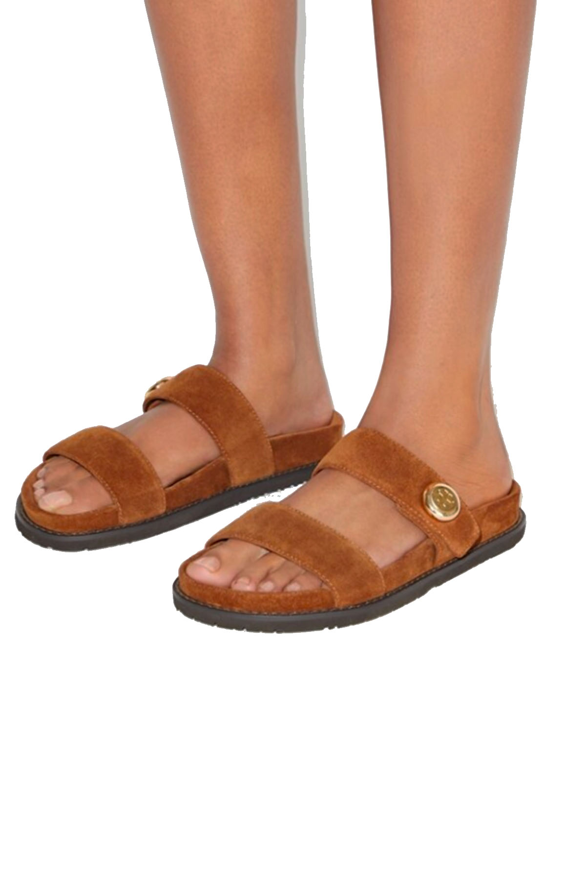 Sandalo a doppio cinturino è realizzato in morbido suede con cuciture tono su tono sui cinturini e bottone decorativo con logo Romy, soletta ergonomica modellata e la suola con battistrada garantiscono comfort e trazione.