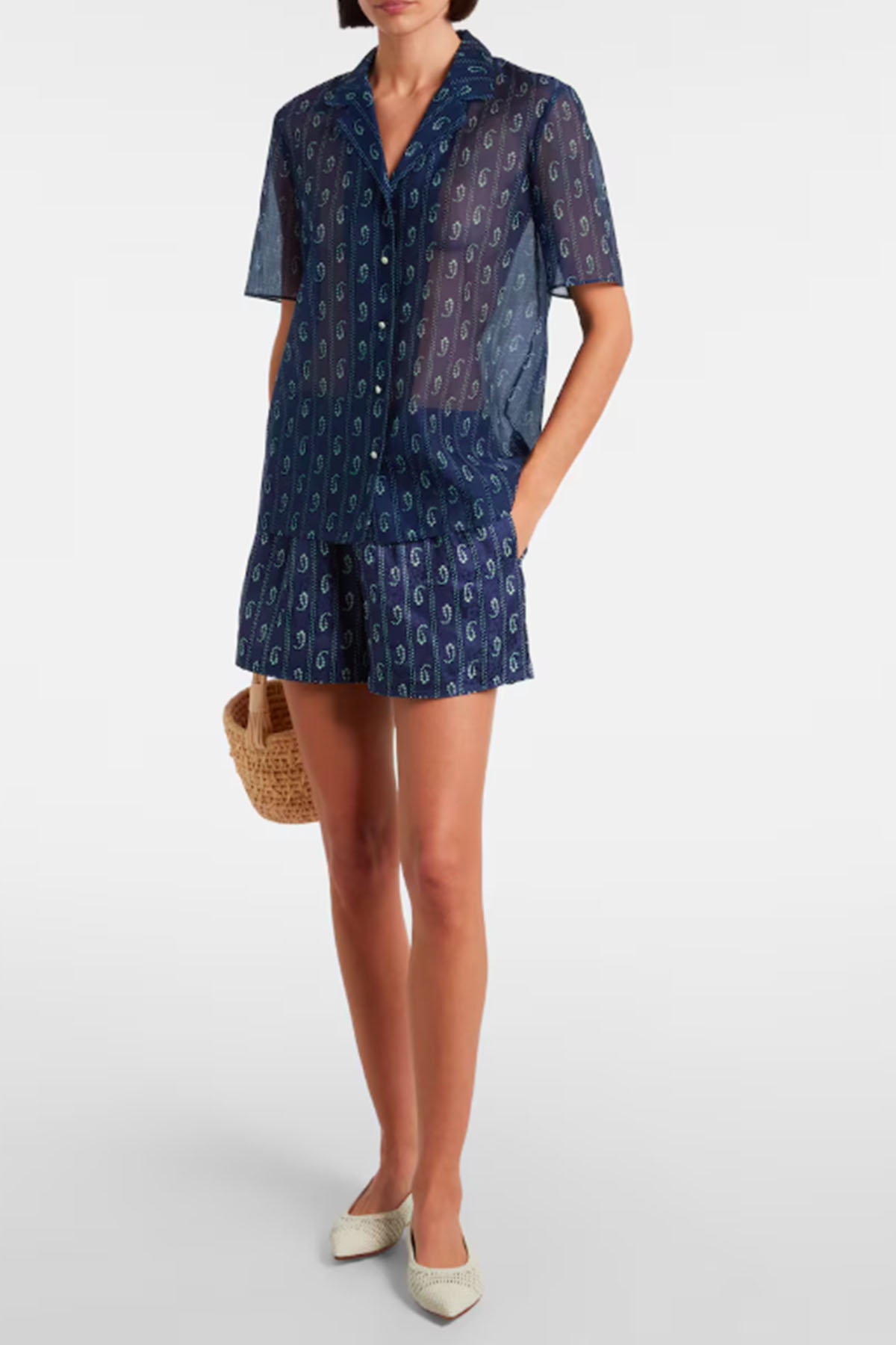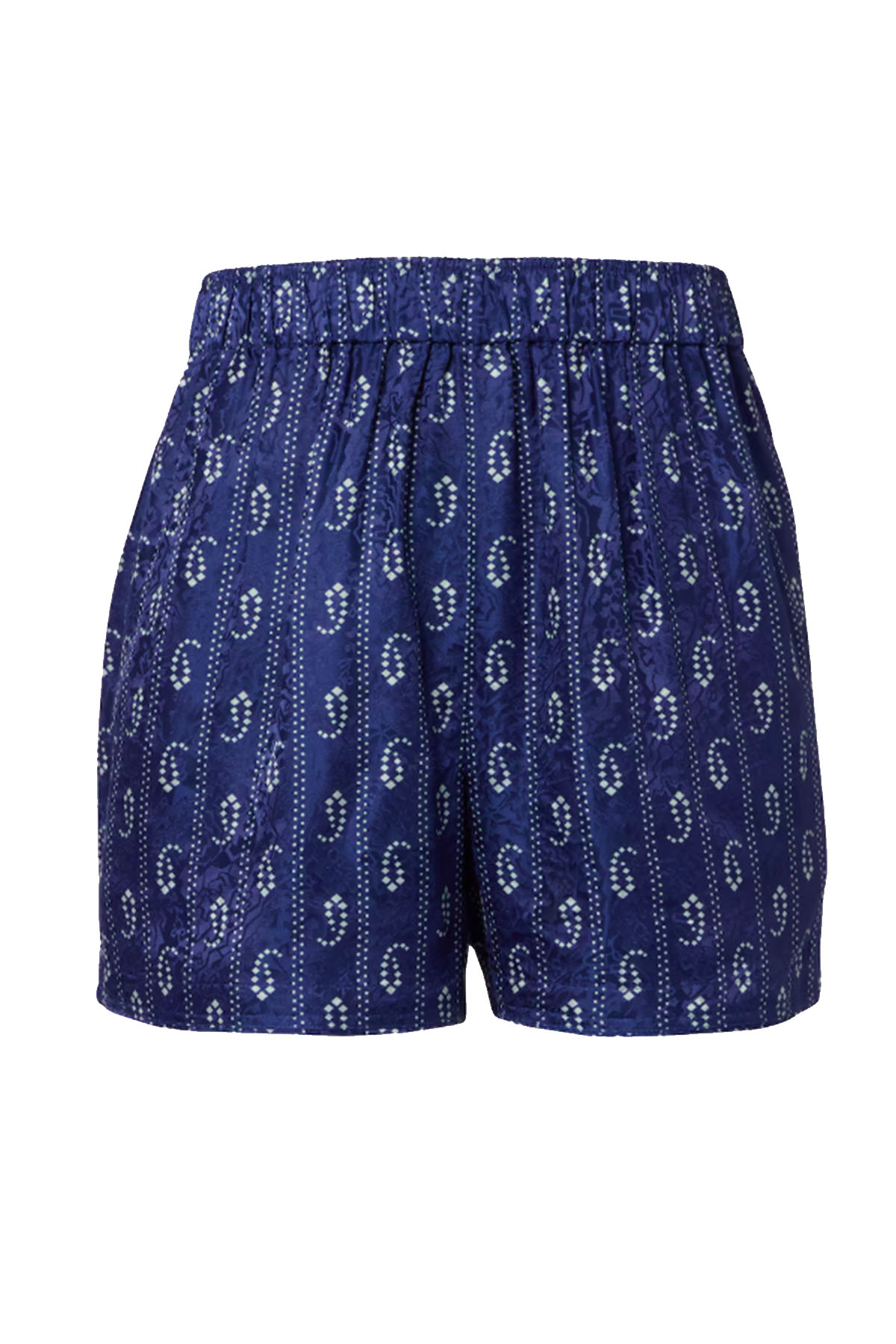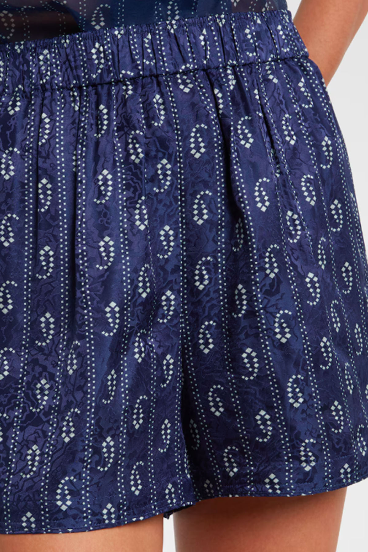 Modello con fascia elastica in vita, tasche su cuciture laterali, design corto.